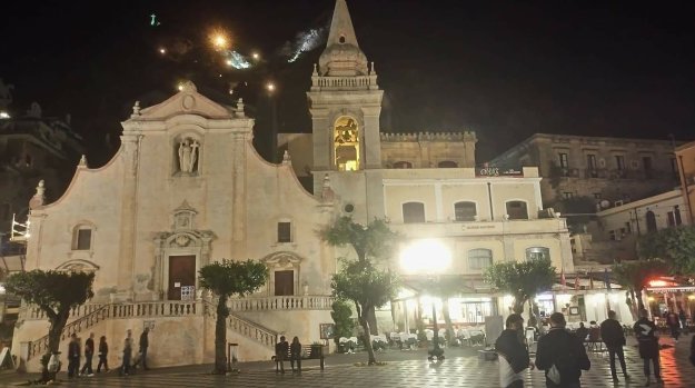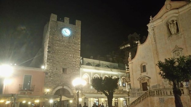 Doch irgendwann ist auch das geschafft. Ein Zug kommt und um halb 8 sind wir in Taormina und tauchen ein die nächtliche Szenerie, die wie eine Opernkulisse wirkt.