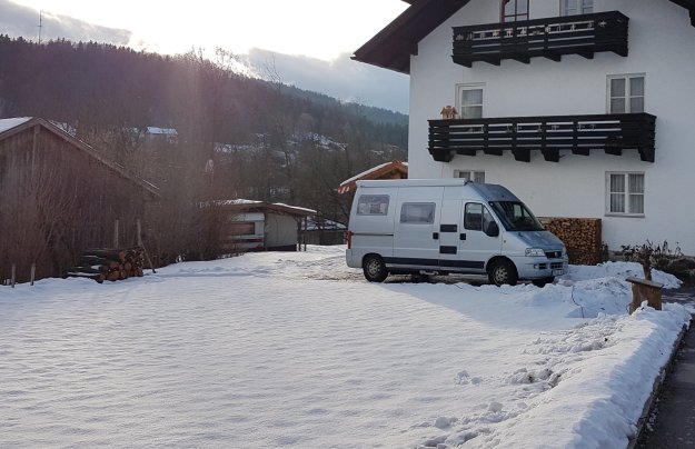 Tolle Schneeverhältnisse und einen Wintercampingplatz haben wir in Lam nahe der tschechischen Grenze gefunden. Der kleine Campingplatz hat schneebedeckte Rasenflächen und einen festen Stellplatz neben dem Haus, den nehmen wir doch einfach für unsere zwei Nächte.