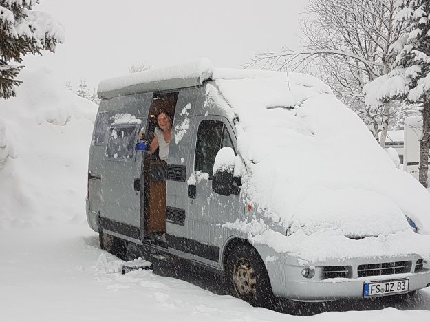 Rundherum ist geschäftiges Treiben. Manche schieben sich nur einen Weg frei, andere schippen ihren gesamten Stellplatz frei. Ich mache uns einen kleinen schneefreien Weg.