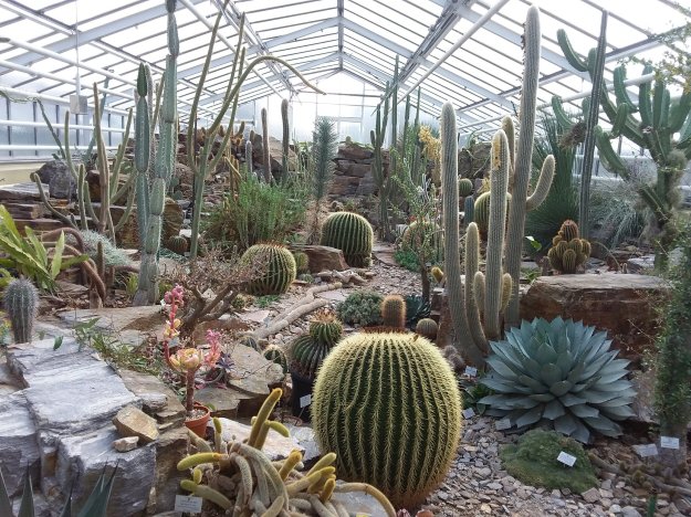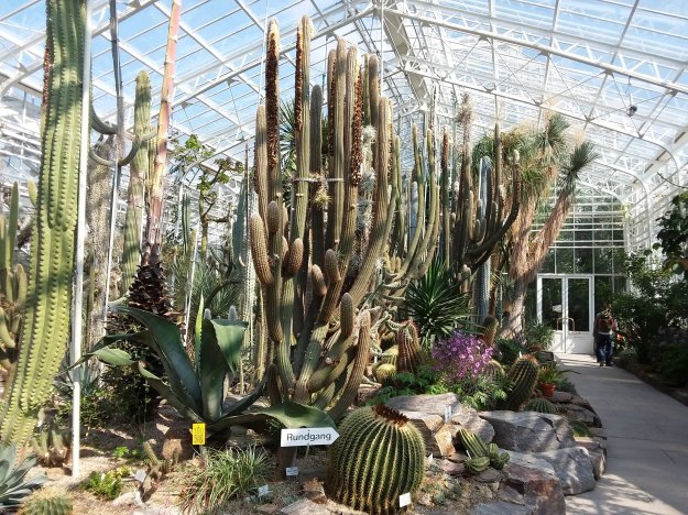 Auf die Pracht der übrigen (Rosen-, Kräuter-, Nutzpflanzen-, Rhododendron-)beete müssen wir noch ein paar Wochen warten. Aber es gibt ja noch die Treibhäuser. Kakteen, Orchideen, Palmen…