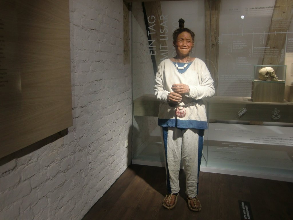 Sie empfängt uns mit einem verschmitzten Lächeln. Ihre langen schwarzen Haare sind zu einem lustigen Knoten auf dem Kopf zusammengebunden, ihr weißer Anzug aus Leinen wird von einem mit einer prächtigen Muschel geschmückten Gürtel zusammengehalten. An den Füßen trägt sie Bastschuhe. Sie ist 1,45m groß, wurde vor über 7000 Jahren geboren und auf den Namen Lisar getauft, weil sie seit Oktober in Landau an der Isar den Mittelpunkt der neuen Ausstellung im Museum Kastenhof bildet.