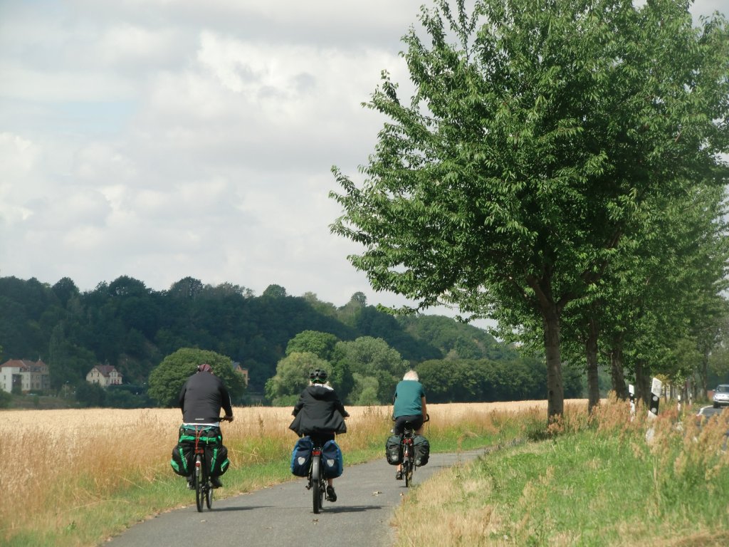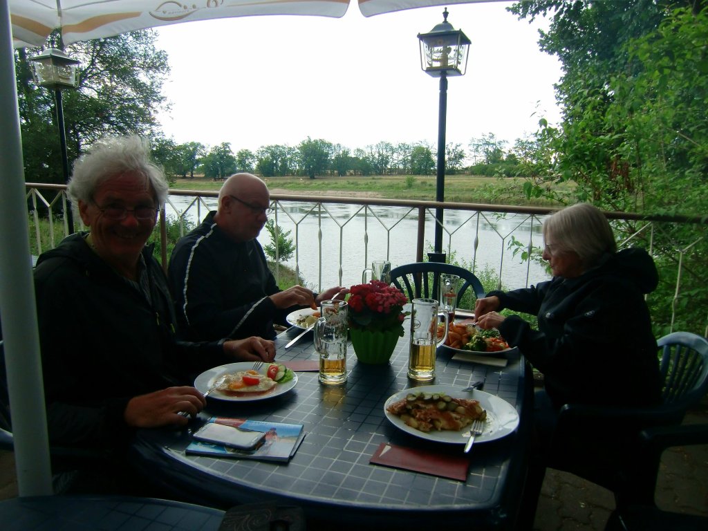 Wir passieren ein paar kleine Dörfer, in denen wir kaum einen Menschen sehen, und eine Stadt, Riesa, in der ein bisschen Industrie für Arbeitsplätze sorgt und den Blick des Elbtouristen trübt. Am frühen Nachmittag würden wir gern irgendwo einkehren, finden aber erst nach 15 Kilometern einen netten Gastgarten an einem kleinen See. Vor lauter Begeisterung über die leckeren Kuchen für die anderen und einen Teller Schmorgurken mit Kartoffeln für mich, vergesse ich leider, ein Foto zu machen.