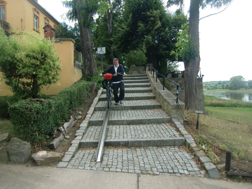 Es ist ein leichtes Radeln, denn es sind heute wenig andere Radler unterwegs, alles ist flach, der Asphalt unter unseren Rädern ist griffig und eben. Aber nur meistens, nicht immer. Mal müssen wir eine Treppe hinunter, eine schmale Metallrinne dient als Schiebehilfe.