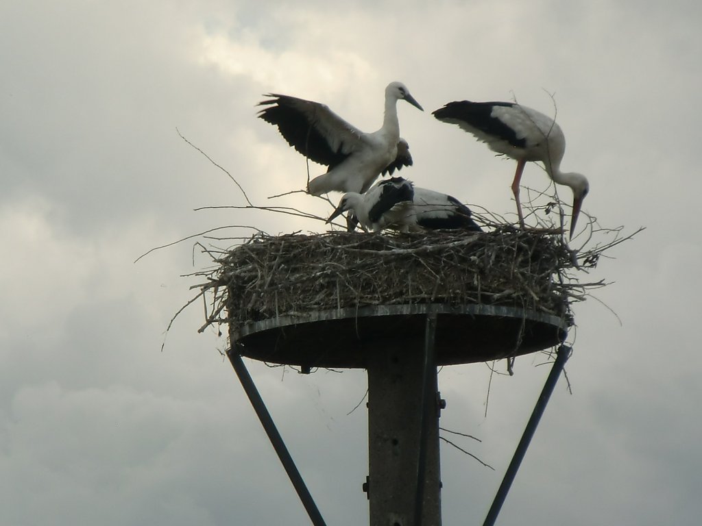 Wir haben Glück mit dem Wetter. Es kommt viel weniger Regen als vorhergesagt herunter. Kaum haben wir uns in unsere Regenmontur geworfen, kommt die Sonne raus. Ein Höhepunkt ist ein Storchennest am Wegesrand, das von Jungstörchen und Mama Storch bewohnt wird, die gerade mit Renovierungsarbeiten befasst ist.