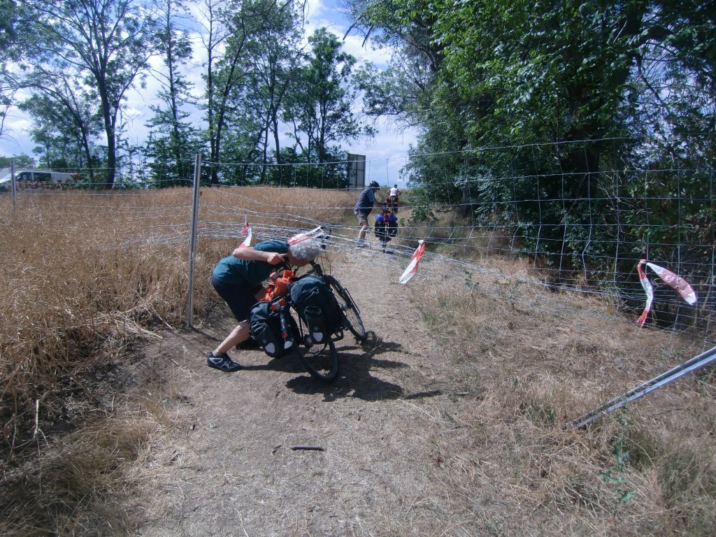 Einnmal ist der Weg wegen einer Baustelle abrupt zu Ende. Ohne Hinweis, ohne Umleitungsschild. Wir folgen einem Trampelpfad, der auch unter hochgedrückten Zäunen durchführt.