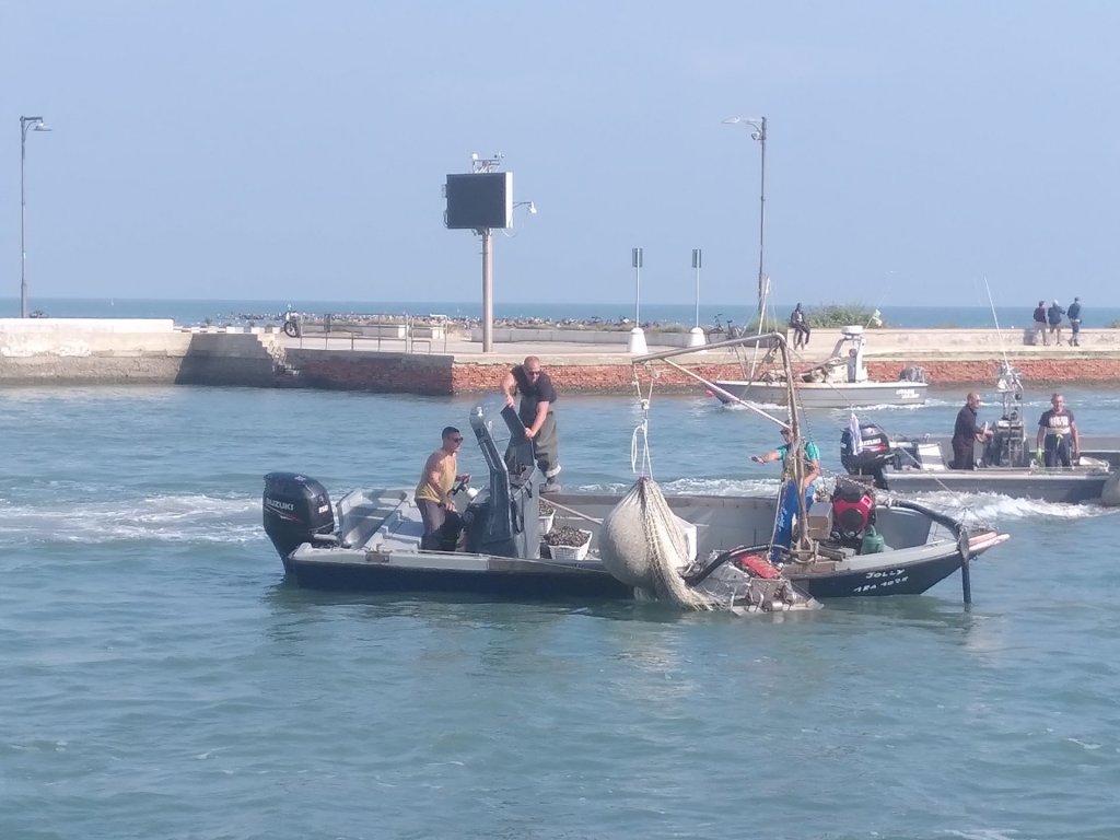 Ehe wir das Boot besteigen, schauen wir Fischern bei der Arbeit zu, die ein Netz über den Boden des Kanals ziehen und bis zum Rand mit Muscheln gefüllt wieder rausziehen.