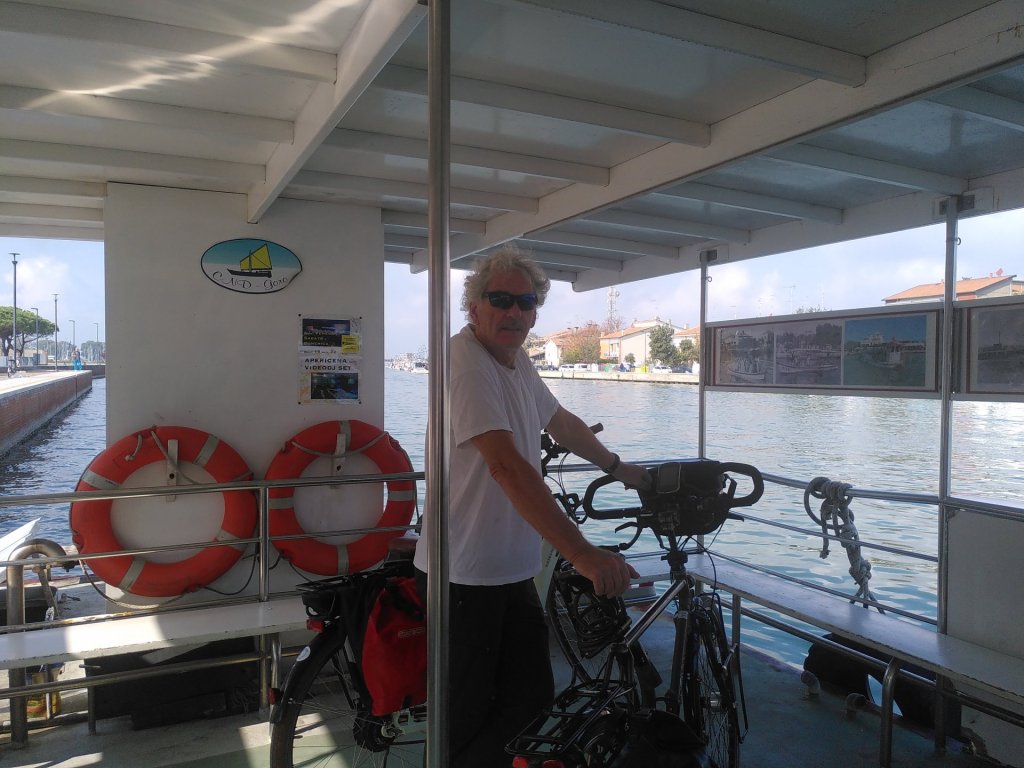 Unsere Radtour rund um die Lagune von Comacchio ist 55 km lang und beginnt mit einer Fährfahrt von einer Minute über einen Kanal. Dies erspart uns eine viel befahrene Brücke und macht erheblich mehr Spaß.