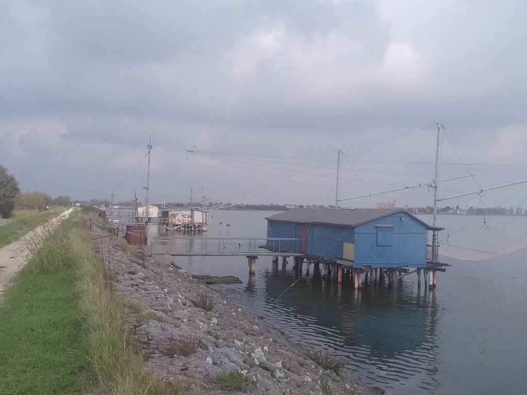 Wir radeln weiter nach Comacchio, den Weg kennen wir schon von gestern. Heute verlassen wir den Ort Richtung Westen und stoßen bald auf einen kleinen Pfad entlang der Lagune mit Blick auf zahlreiche Fischerhütten. Sie säumen die ersten fünf Kilometer unseres Weges. Einfache Holzhütten stehen auf Pfählen im Wasser. Außen sind riesige Fangvorrichtungen befestigt, die ins Wasser gesenkt werden können.