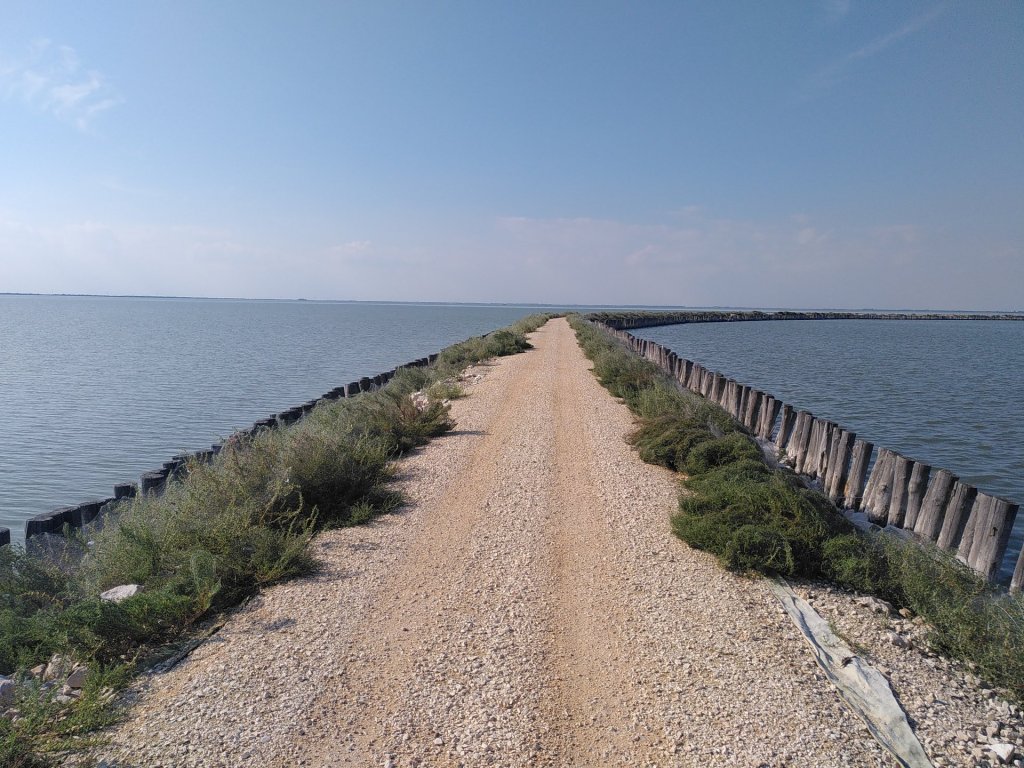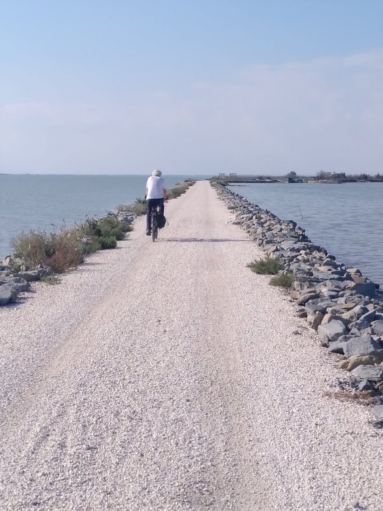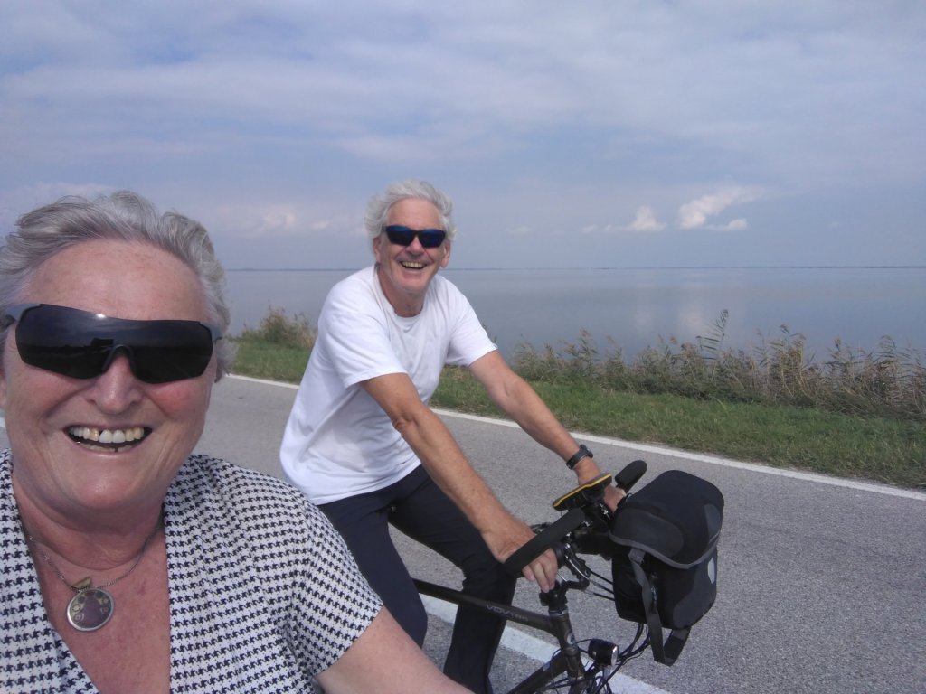 Etwa 15 Kilometer vor dem Ziel entdecken wir einen Wegweiser zum Lido di Spina. So heißt der Ort vor Lido degli Estensi, wo unser Bus steht. Wir wundern uns, denn das Schild weist in Richtung Wasser und Achims Navi protestiert auch bald, nachdem wir uns auf den Weg gemacht haben: „Keine fahrbare Strecke“. Haha, weit gefehlt. Ein sehr schmaler, aber bestens befahrbarer Damm führt uns mitten durchs Wasser unserem Ziel entgegen. Wir sind begeistert. Ich weiß nicht, ob ich jemals eine eindrucksvollere Strecke geradelt bin. Es ist wie Radfahren auf dem Wasser. Unglaublich schön. Und ein bisschen surreal.