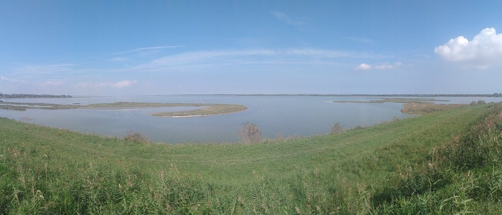 Immer wieder ist die Lagune von kleinen und größeren Dämmen und Inselchen durchzogen. Sie umfasst 11 000 Hektar und gilt als die größte italienische Lagunenlandschaft mit Brackwassergebieten.