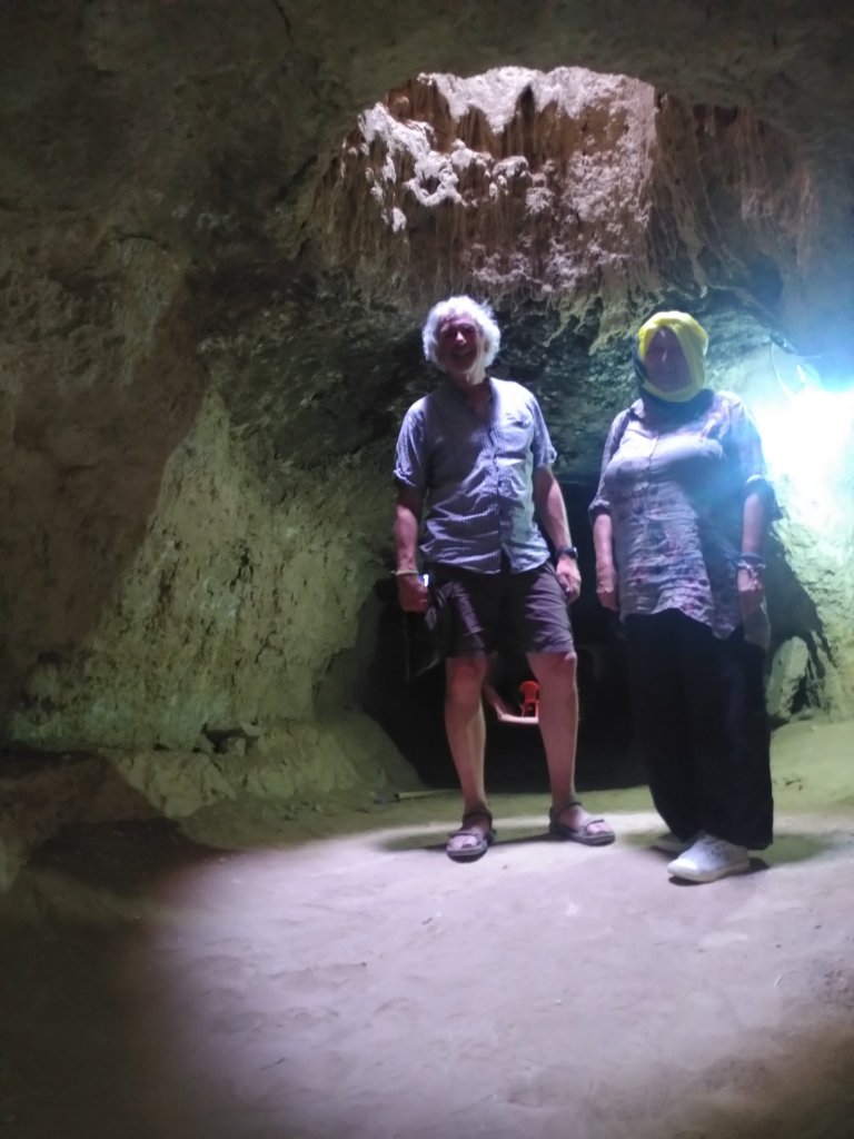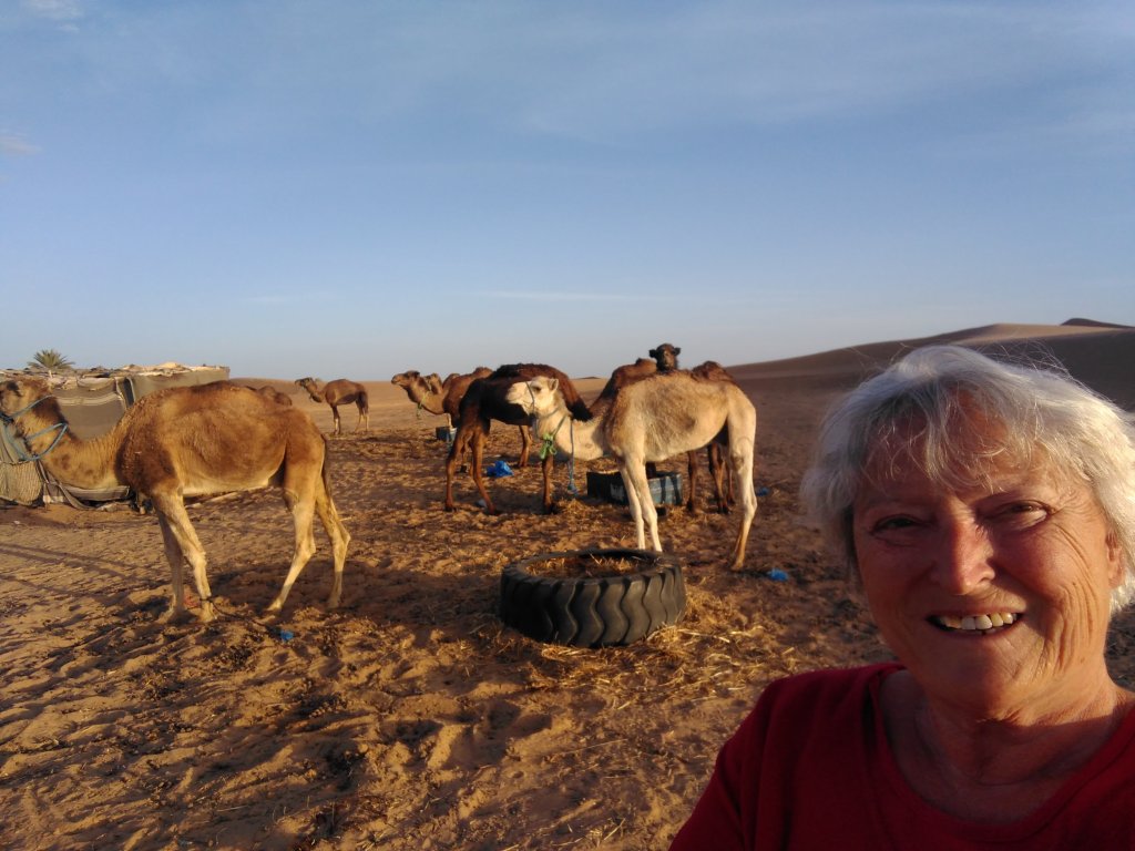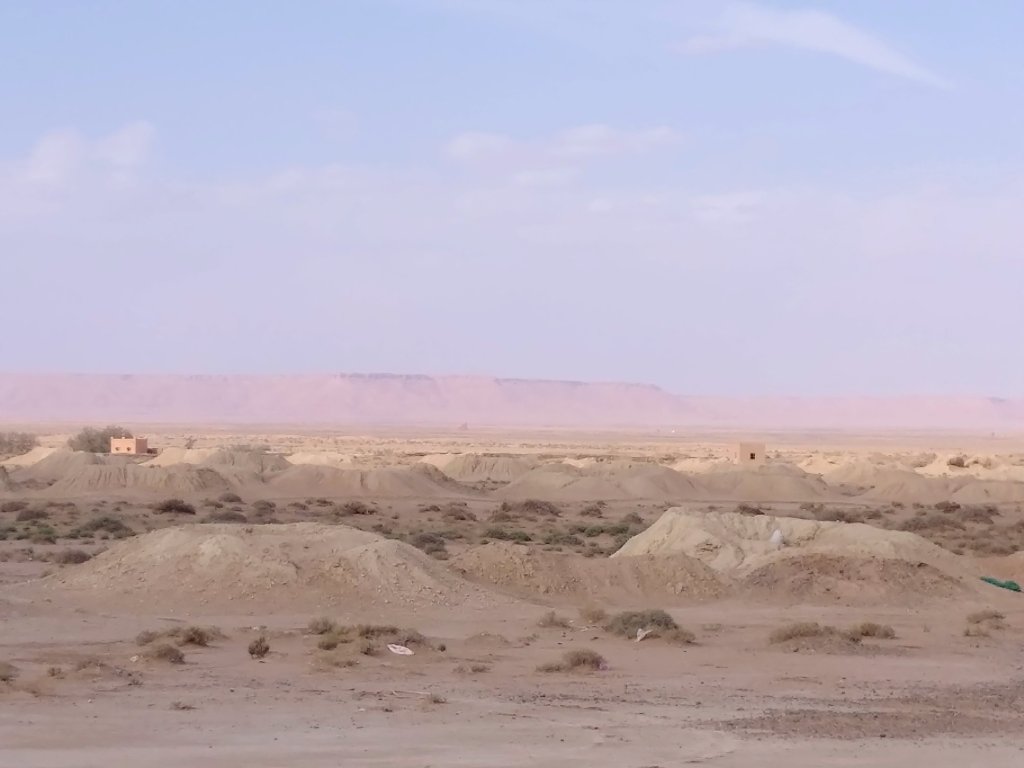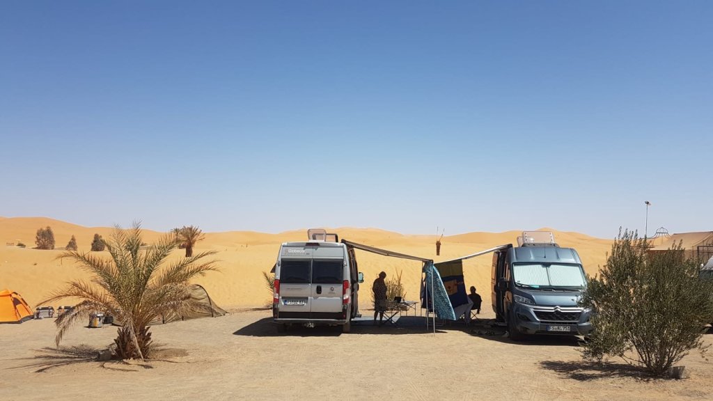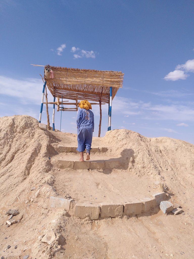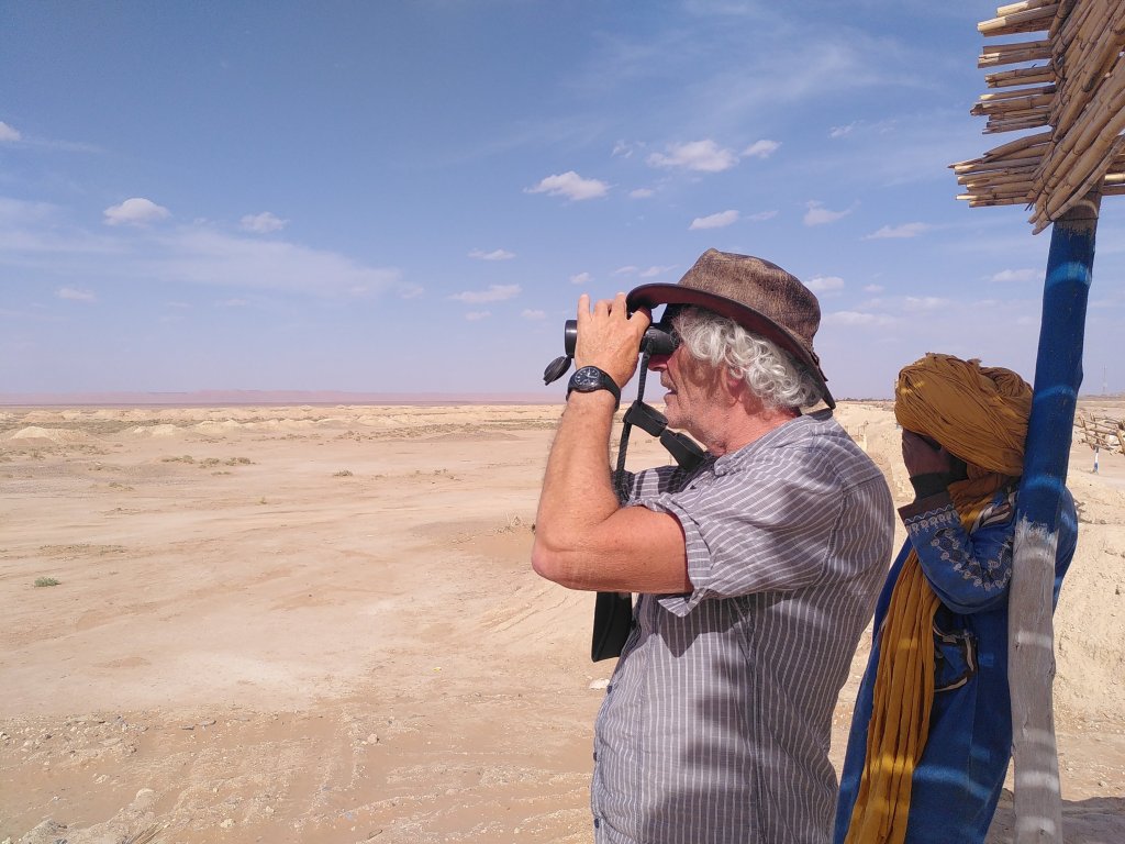 Ali ist auch derjenige, der sofort Bescheid weiß, als ich ihn nach der Landart von Hannsjörg Voth frage. Er war noch ein Junge, als „Hans“ hier arbeitete und bietet uns an, ein Auto mit Vierradantrieb zu besorgen, um uns dorthin zu bringen. Es ist nur zehn Kilometer entfernt, aber er sagt, dass der Weg teils versandet und mit unserem Bus nicht erreichbar sei. Leider werden wir nicht handelseinig. Die 650 Dirham (65 Euro) hätten wir ja noch bezahlt, aber auf einmal tauchten nochmal 150 Dirham (15 Euro) pro Person auf, die wir vor Ort dem Wärter bezahlen müssten. Mein Einwand, dass auch intensive Internetrecherche keinerlei Hinweis auf ein solch geregeltes Einlasssystem geben würde, half nicht weiter. Wir cancelten deshalb die ganze Geschichte und schauten uns die Landart durchs Fernglas an. Sehr schade.