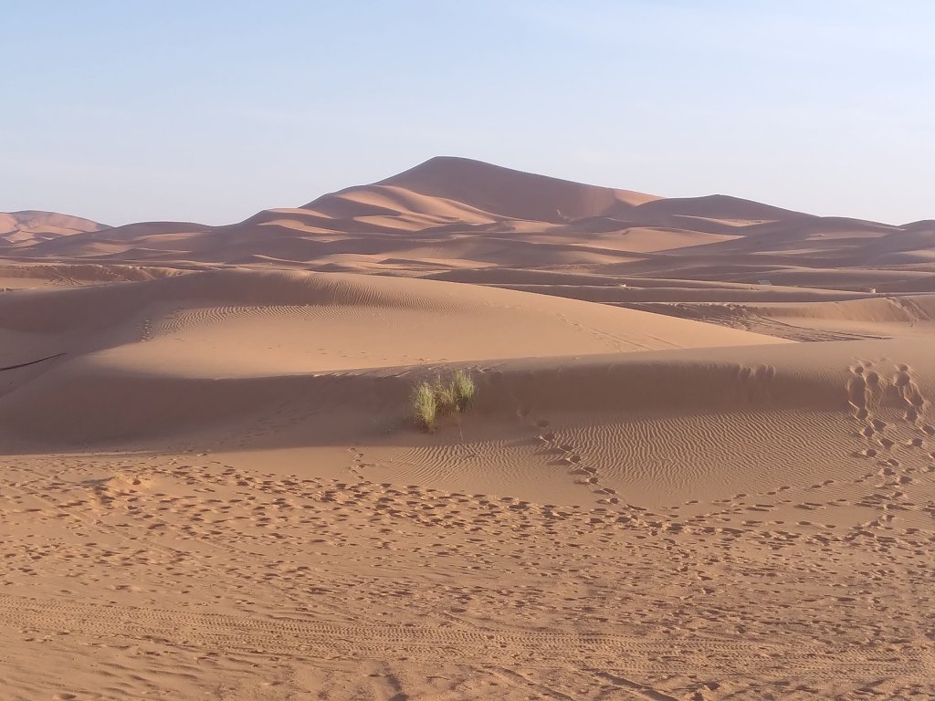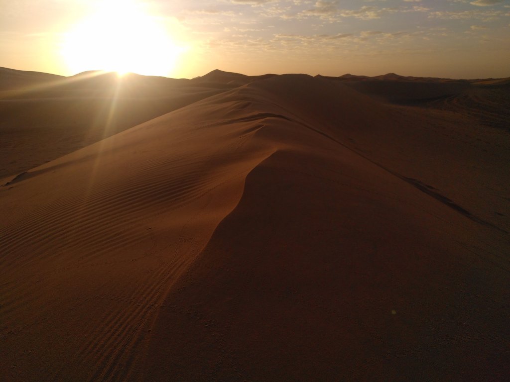 Auch an meinem zweiten Morgen in der Sandwüste lasse ich mir dieses Spektakel nicht entgehen und klettere kurz vor Sonnenaufgang um sechs aus dem Bett. Ich bin nicht die Einzige. Auf den Kämmen der Dünen stehen kleine Gruppen von Menschen oder Einzelne und schauen zu, wie die Sonne hinter einem spitzen Sandberg empor klettert und den Sand in warmes Licht taucht. Zum Glück hält sich die Zahl der motorisierten Wüstenfans zurzeit in Grenzen. Es hat angenehme 16 Grad, unter meinen nackten Füßen fühlt sich der Sand kalt an, was mir alles aber lieber ist als die 30 Grad tagsüber und kochendheißer Sand, den man barfuß gar nicht betreten kann.