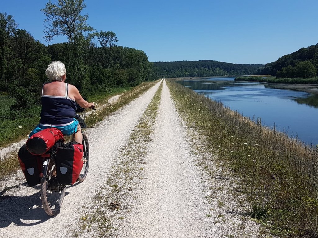Oft führt der Donauradweg über die Deichkrone, warm, aber mit toller Aussicht. Wenn wir dann vom Fluss weggeleitet werden und in den Wald eintauchen, ist das erfrischend wie ein kühles Bad.