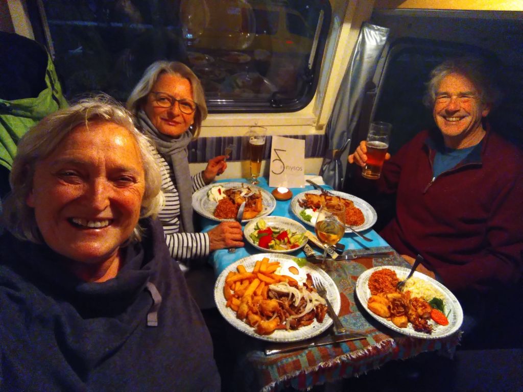 Manche Lokale haben Wohnmobildinner angeboten. Dazu gab es Listen im Internet. In unserer näheren Umgebung waren zwei dabei. Mehrfach haben wir uns dort angemeldet, sind vorgefahren, haben an der Tür bestellt und wenig später wurden uns Getränke und Speisen ans WoMo gebracht.
