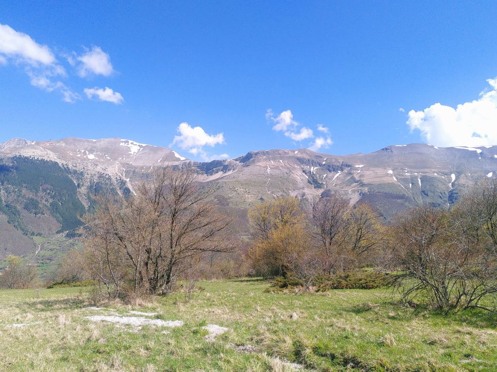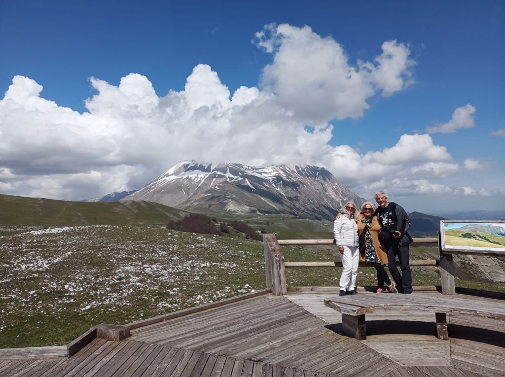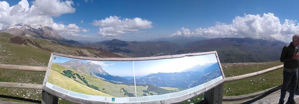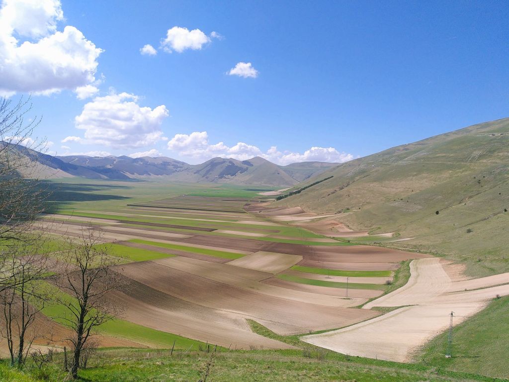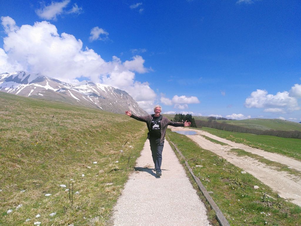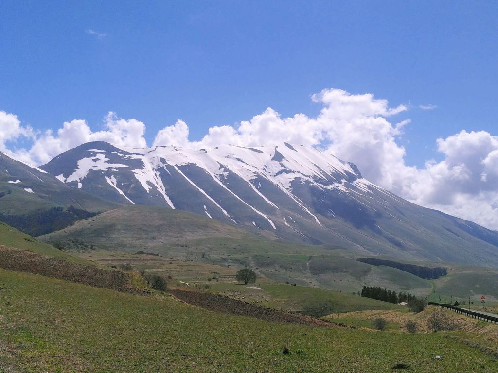 Wir queren nun die Hochebene Piano Grande. Das 30 Quadratkilometer große Wiesenplateau war in der letzten Eiszeit ein See, der später austrocknete. Die Ebene wird eingerahmt von den Monti Sibillini, einem Gebirgszug von 32 Gipfeln, der bis über 2500 Meter ansteigt und damit zu den höchsten des Apennins zählt.