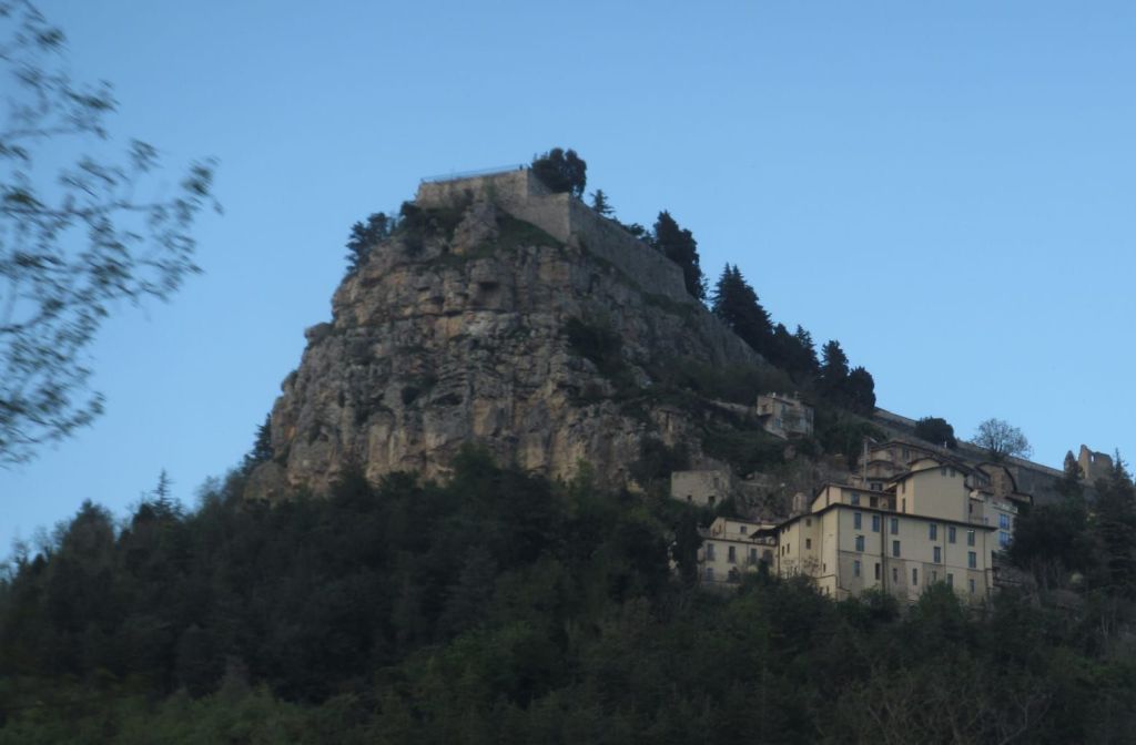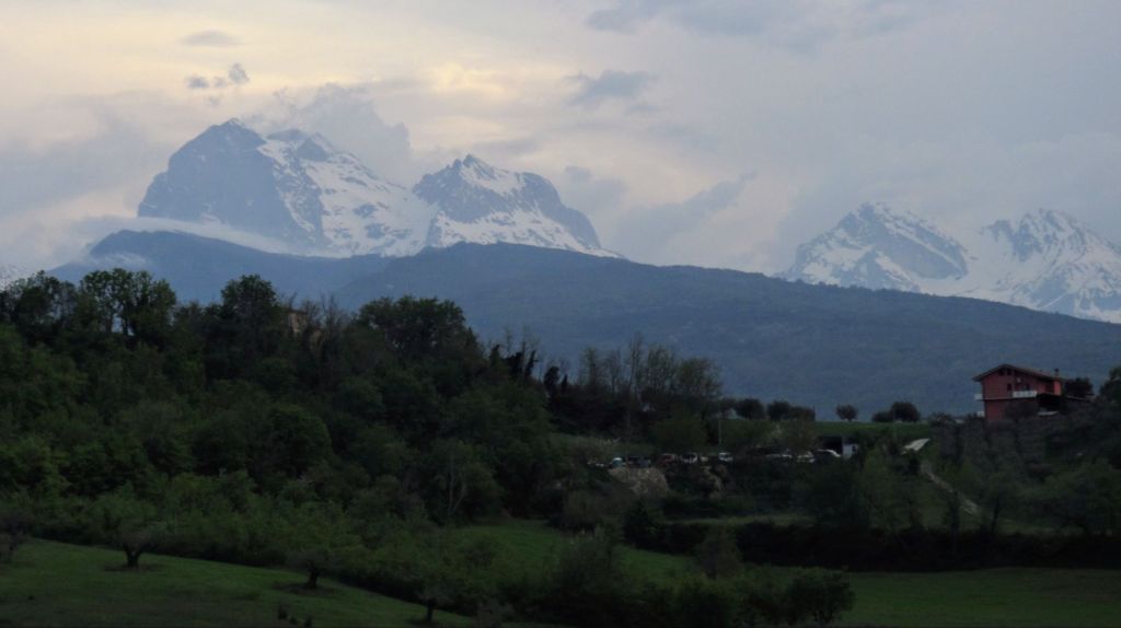100 Kilometer kurvige Straße entlang des Gran Sasso-Massivs bringen uns zu unserem Tagesziel L’Aquila mitten im Nationalpark der Abruzzen. Eine Wildsau mit ewig vielen Jungen quert vor uns die Straße, in optimaler Entfernung: wir müssen nicht scharf bremsen, aber sie sind nah genug, um zu sehen, wie süß die Viecher sind.