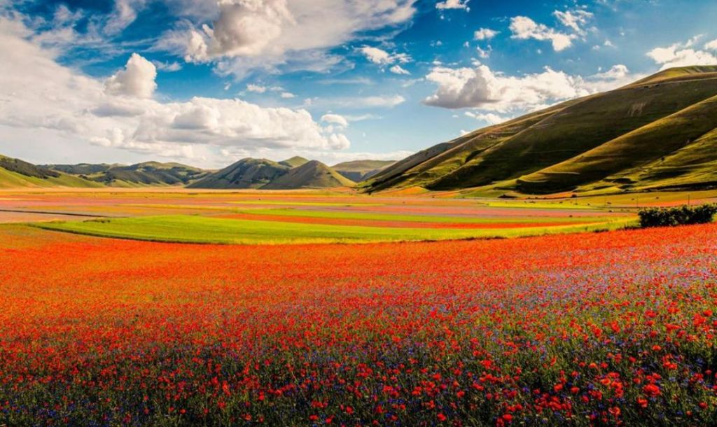 Zwischen Anfang Juni und Ende Juli ist im Bergdorf Castelluccio in den sibellinischen Bergen ein unvergessliches Erlebnis für alle Sinne möglich: Mohn, Kornblumen, Linsen, Narzissen, Enzian und viele andere wild wachsende Arten bilden ein wunderbares Mosaik aus farbenfroher Schönheit und berauschenden Düften. Dafür sind wir zu früh, aber wir sind vom Anblick der nackten gefälteten, teils noch mit Schnee bedeckten Berge dennoch beeindruckt.