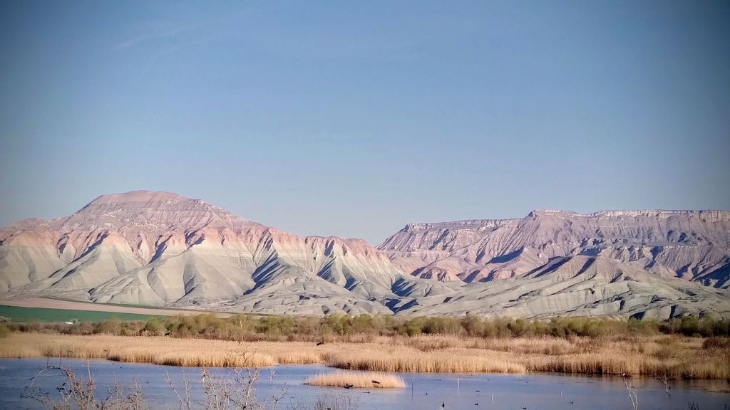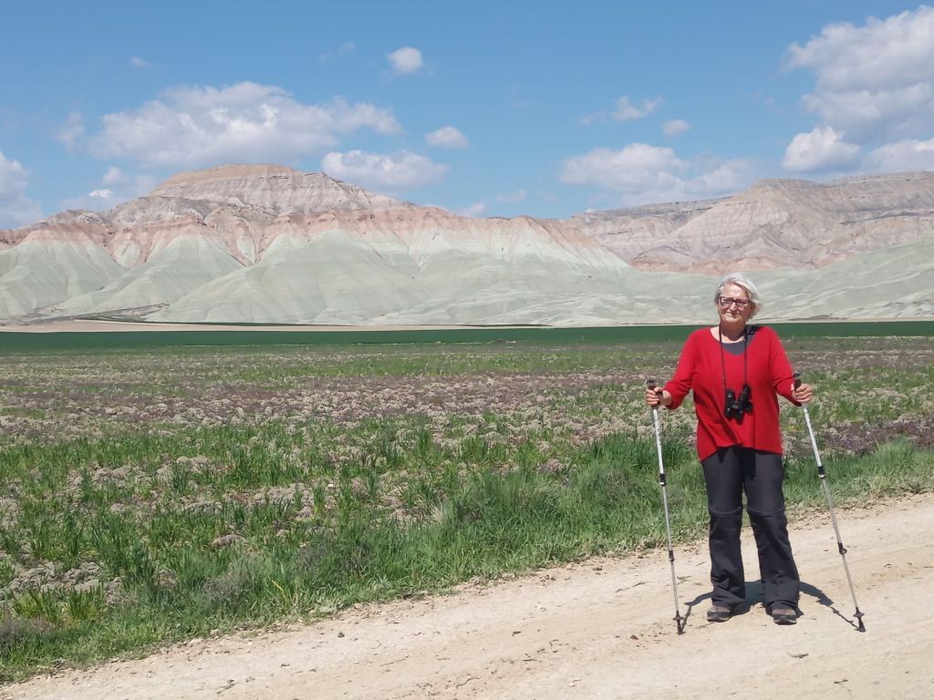 Erst gegen Mittag fahren wir ein Stück weiter, auf Schotterpiste im Halbrund auf die andere Seite des Sees, wo wir die Busse abstellen und einen kleinen Spaziergang machen. Immer mit Blick auf die bunten Berge.