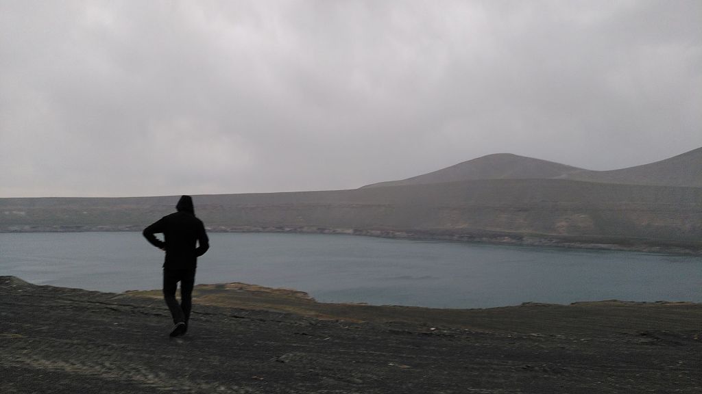 Auf der anderen Straßenseite gibt es einen weiteren Kratersee. Wir machen auch dorthin noch einen kurzen Abstecher. Es wird windig, beginnt zu regnen und ist sehr ungemütlich.