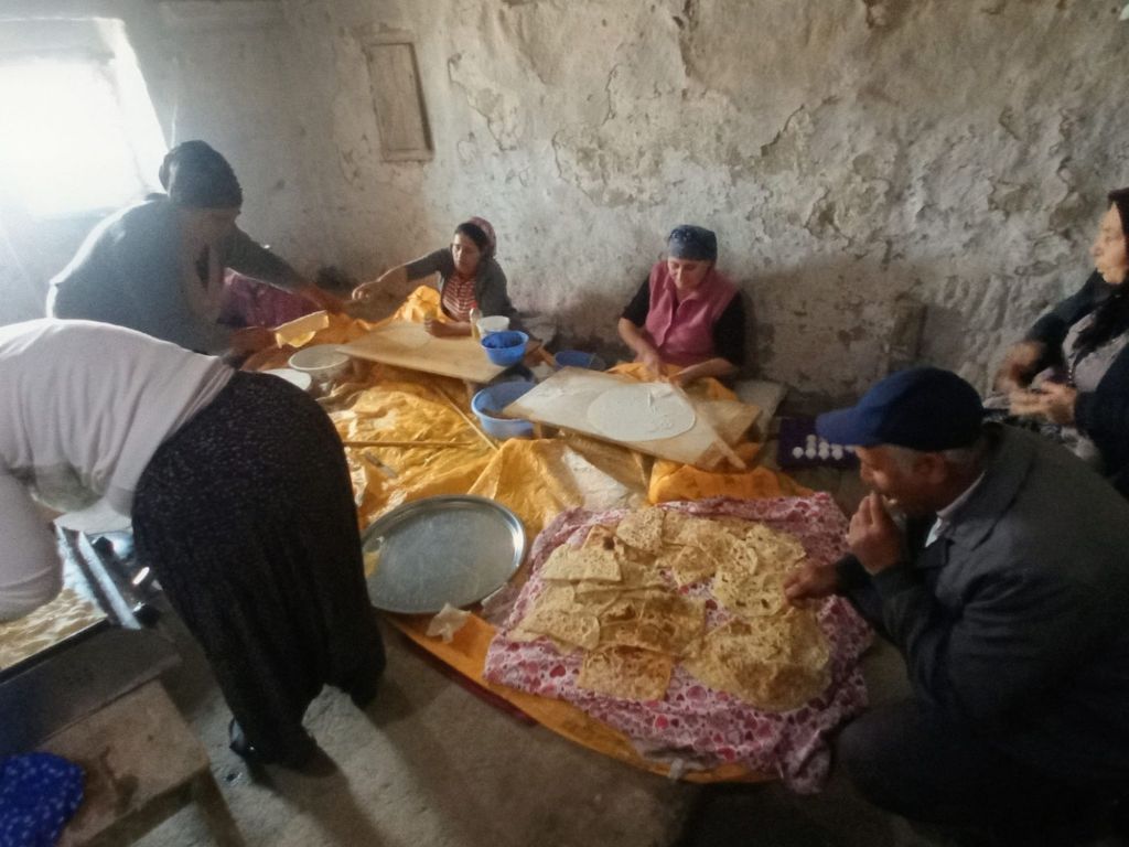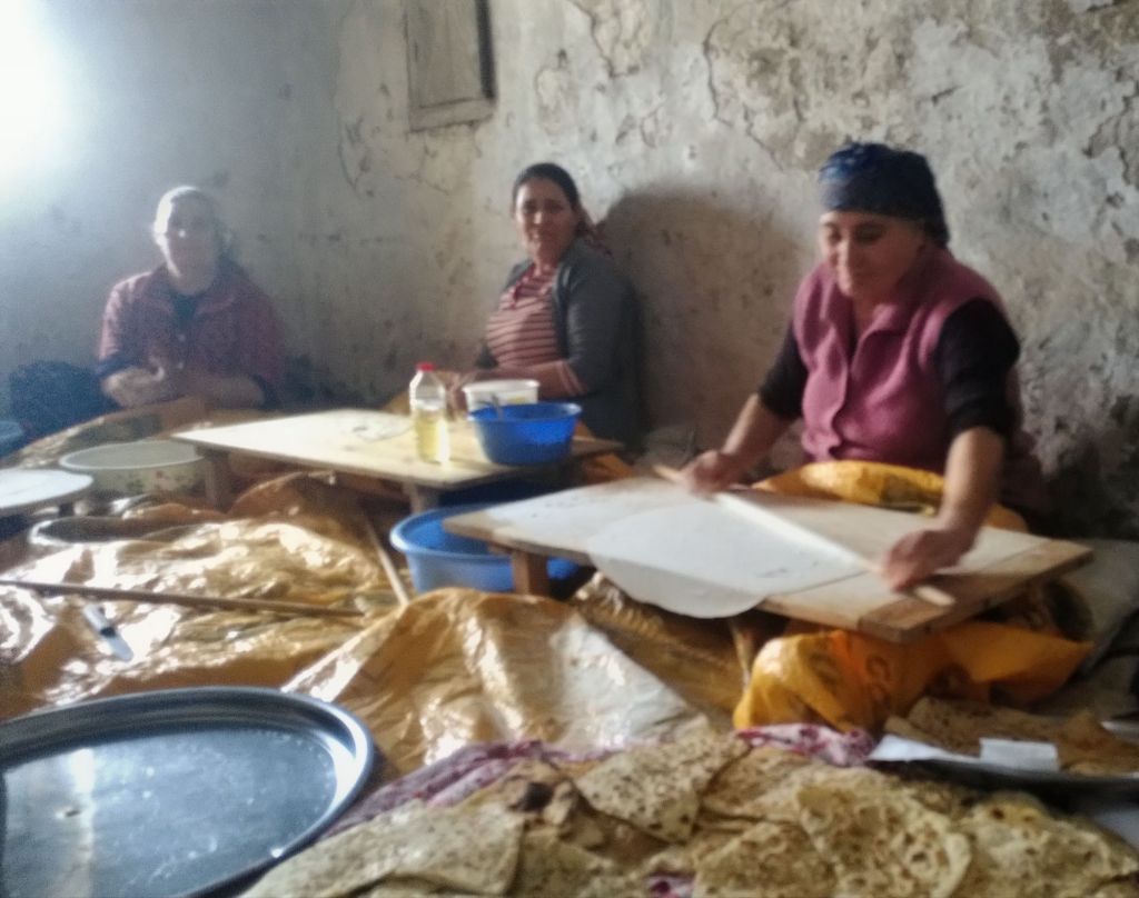 Eine junge Frau tritt aus einem Haus und trägt ein großes Tablett voller Gözleme (dünne gefüllte türkische Pfannkuchen). „Bitte nehmt!“, werden wir aufgefordert. „Wirklich?“, vergewissern wir uns. „Ja! Bitte!“ Dankend langen wir zu. Hmmm, lezzetli, köstlich! Der Mann winkt uns weiter. „Gel! Gel!“, „Kommt!“ Wir folgen ihm in einen dunklen Raum, der aus dem Fels gearbeitet worden war. Als sich meine Augen an das Dämmerlicht gewöhnt haben, erkenne ich die Szenerie: Sechs Frauen sitzen im Halbrund auf niedrigen Hockern und bereiten Gözleme fürs ganze Dorf zu.