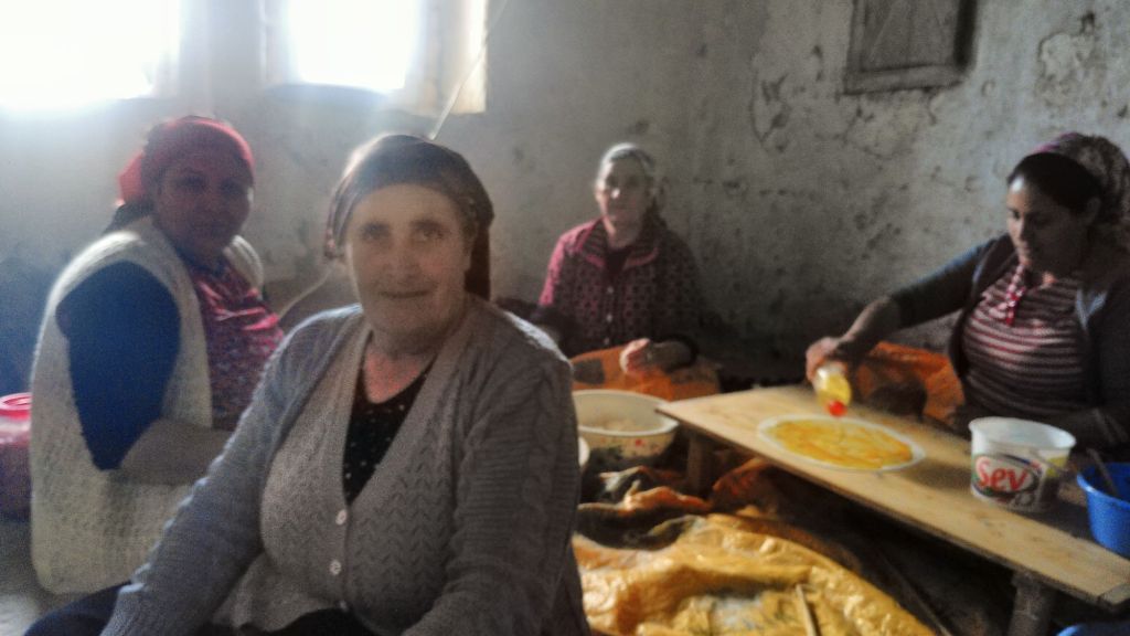 Auch sie heißen uns vielstimmig willkommen und fordern uns auf, nochmal bei dem riesigen Berg Gõzleme zuzugreifen. Ein Stuhl für mich wird organisiert, Ayran, gesalzener Joghurt, serviert. Einmal im Monat treffen sie sich, um Gözleme für alle Haushalte herzustellen, erfahren wir.