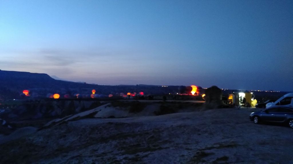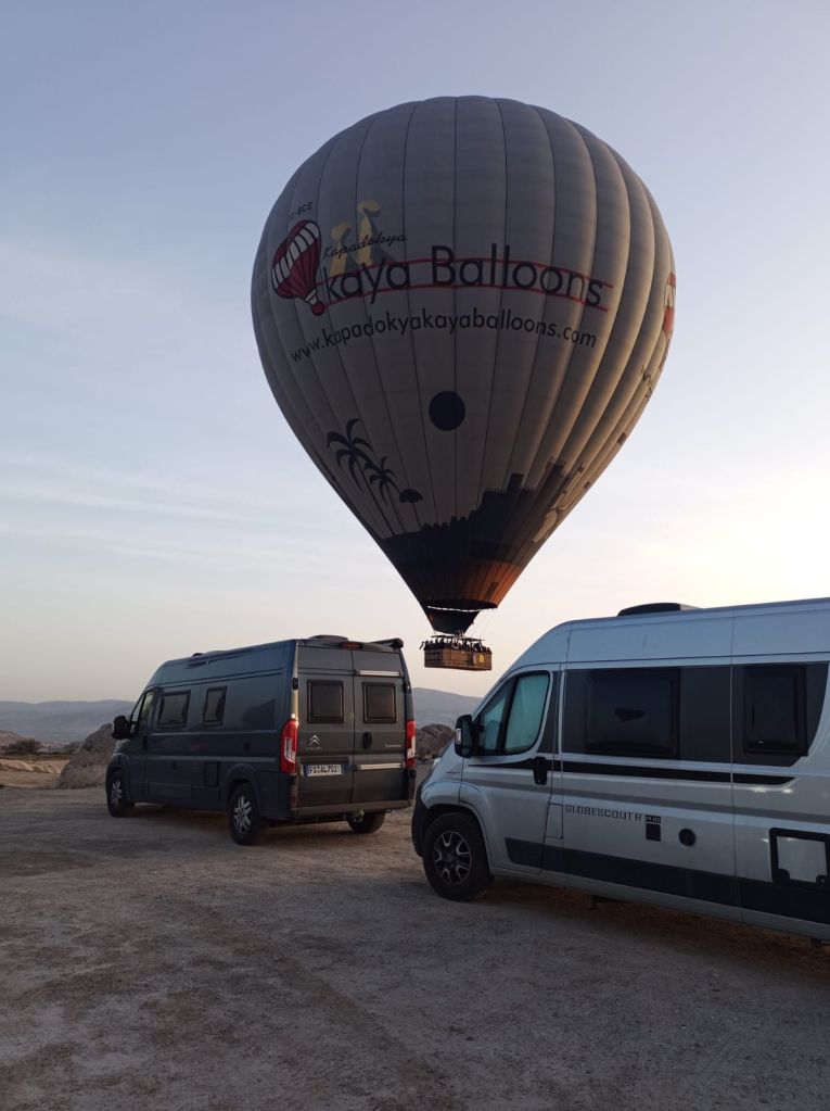 Irritiert lausche ich, ob es unsere Heizung ist, die um halb Sechs diesen Krach macht. Oder ist es der Kühlschrank? Achim schiebt das Rollo hoch: „Es geht los!“ Im Pyjama steigen wir aus dem Bus und staunen. Eine Phalanx von Ballonen steht aufgereiht im Tal, langsam steigt einer nach dem anderen auf. Das Zischen des Gases war das Geräusch, das uns geweckt hat.