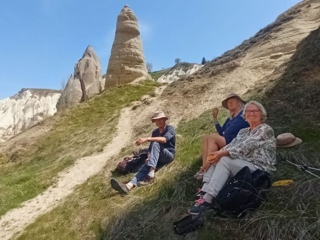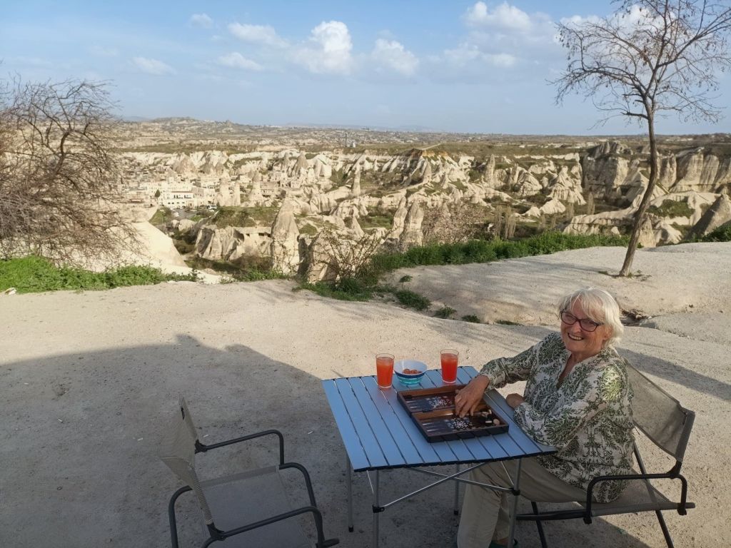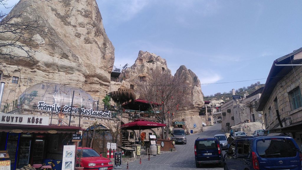 Nun gelüstet es uns nach Kaffee und Kuchen und einem kleinen Stadtbummel in Göreme. Dann suchen wir die Pension, in der wir vor Jahren auf zwei Reisen gewohnt haben und in der ich einen der schönsten Abende meines Lebens mit zwei türkischen, zwei israelischen und mehreren italienischen Musikerinnen und Musikern verbracht habe. Wir erkennen das Haus im Fels wieder, aber der Besitzer hat gewechselt, es gibt neue Anbauten und die Nachbarschaft wie die gesamte (Alt-)stadt platzt vor Geschäften, Bars, Restaurants, Hotels und Pensionen. Zur Hauptsaison möchte ich nicht hier sein.
