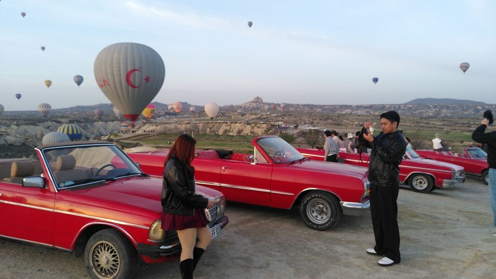 Schnell füllt sich das Plateau, auf dem wir heute Nacht allein standen. Ein PKW nach dem anderen kommt und bald sind an die Hundert Schaulustige um uns herum. Eine Gruppe roter Cabrios hat sich versammelt, elegant die Besatzung.