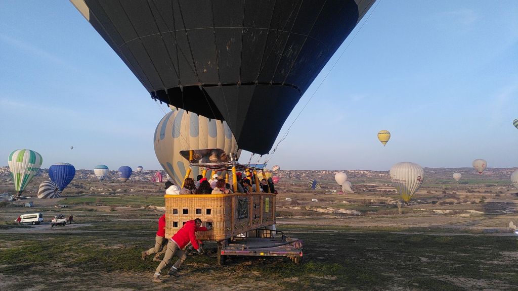 Einige Ballons landen nach etwa einer Stunde auf unserem Plateau. Die Transportanhänger sind eingetroffen und die Piloten versuchen, direkt darauf zu landen.