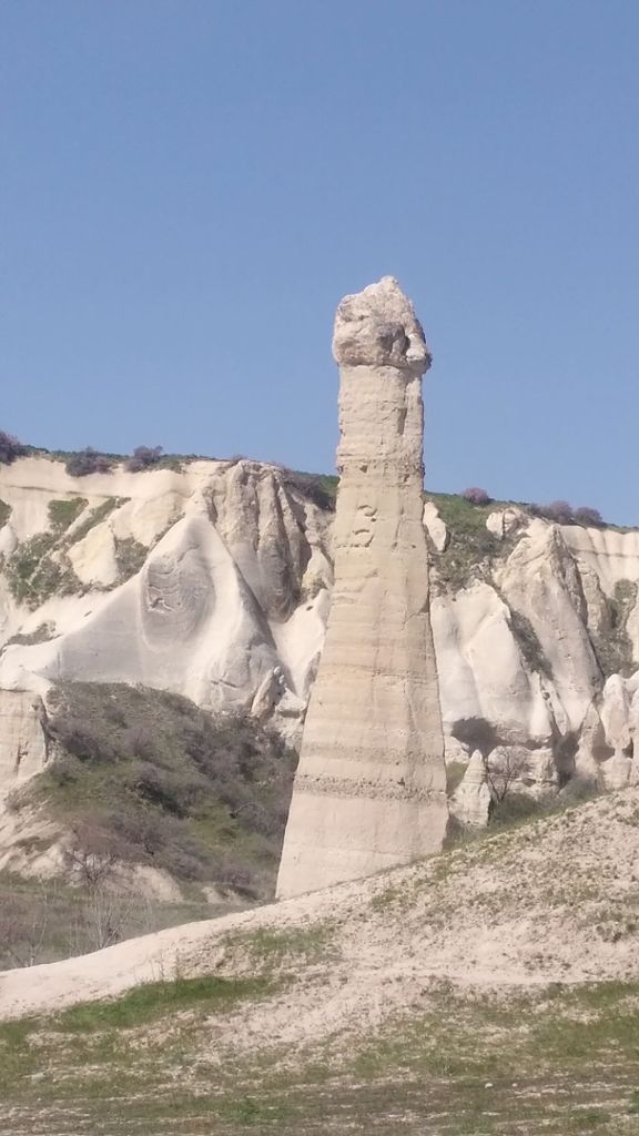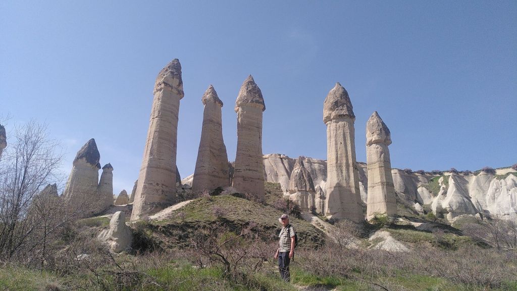 Unter uns liegt das sogenannte „Liebestal“, aber es gibt keinen Weg hinunter, wir müssen mit unseren Campern hinfahren. Das Liebestal hat seinen Namen von den vielen bis zu 40 Meter hohen phallusförmigen Feenkaminen, die hier allerorten stehen. Es gibt schöne Wege durchs Tal, wie immer teils zum entspannten Flanieren, teils zum Kraxeln und Aufpassen, dass man nicht ausrutscht.