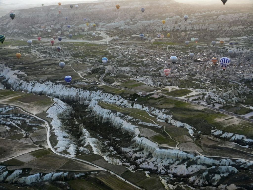 Und es geht wieder hinunter. Die Apfelblüten unter uns sind zum Greifen nah. Lautlos gleiten wir über die zerklüftete Landschaft. Um kurz nach Sechs geht die Sonne auf. Andächtiges Schweigen an Bord.