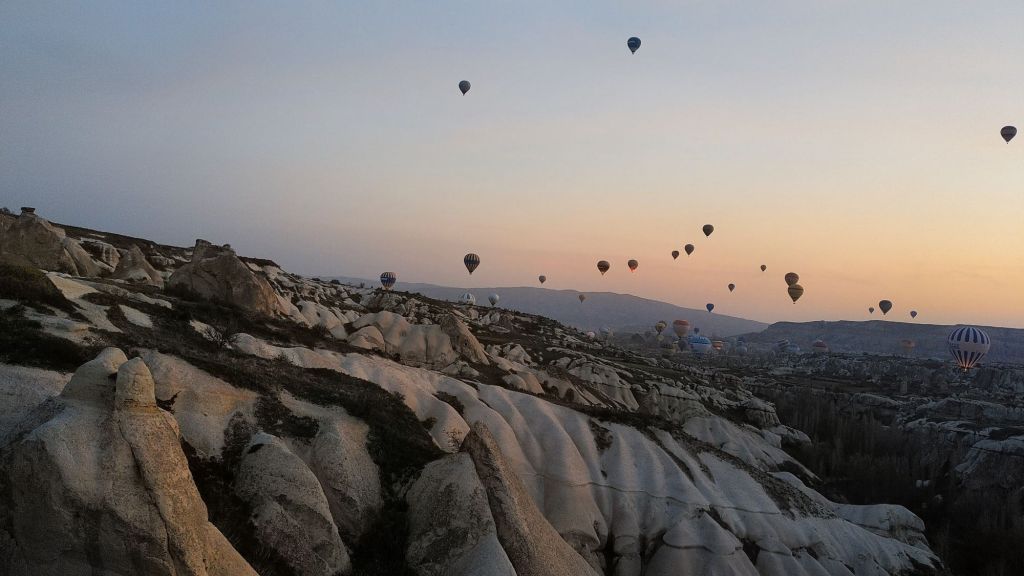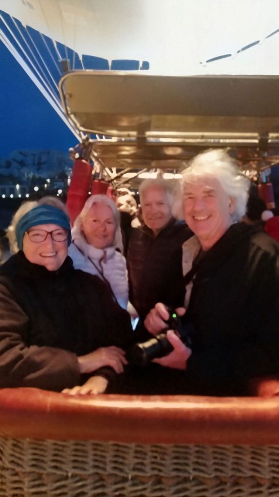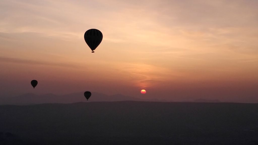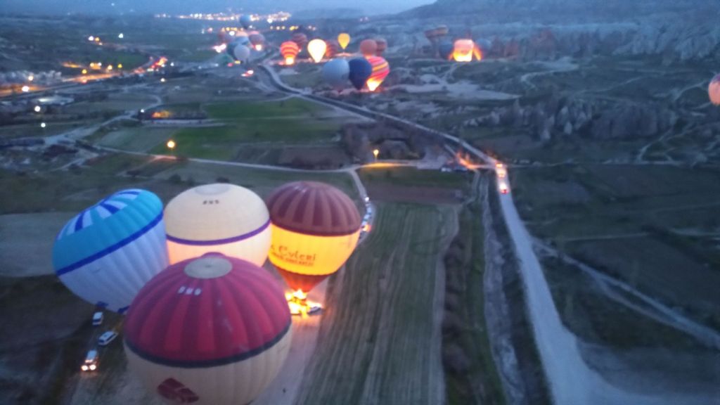 Schnell sind wir auf 500 Meter. Unter uns die Lichter der Stadt, um uns herum viele Ballone. Wir fahren auf eine Felswand zu, scheinbar im letzten Moment lässt der Pilot heiße Luft in den Ballon und wir steigen hinauf. Schweben. Staunen.