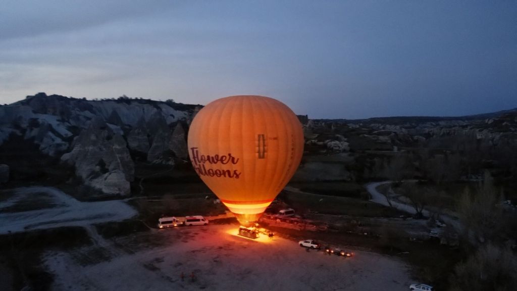 Um 5.08 Uhr wird der Ballon ausgerollt. Die Crew bläst Luft hinein, der Stoff bläht sich auf. Dann muss es schnell gehen, denn wir sind noch an unserem Truck befestigt und den sollten wir besser nicht auch noch mit in die Höhe nehmen. Wir vier und noch so um die 20 Leute klettern über eine Minileiter in den Korb. Dann heben wir ab. Langsam dämmert es.