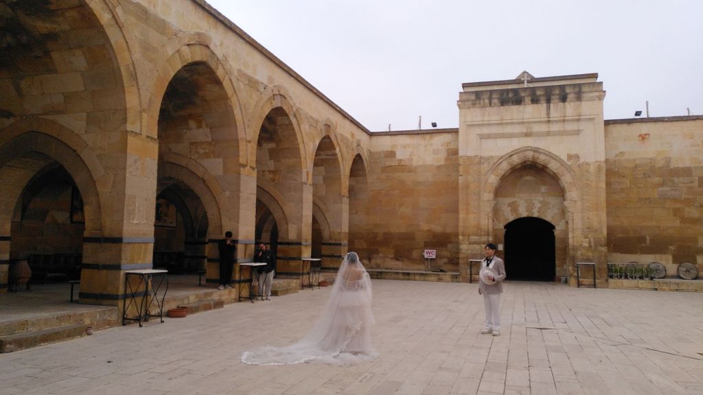 Kurz nach dem Start stoppen wir allerdings schon wieder. Auf der alten Seidenstraße gibt es so viele Karawansereien. Diese hier heißt Sarıhan und wird gerade von einem Brautpaar als Fotokulisse genutzt.
