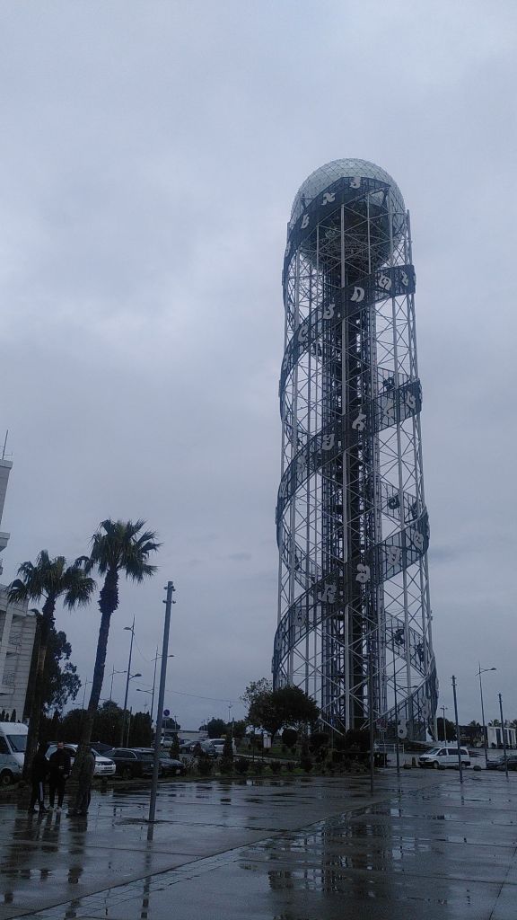 Wir laufen weiter zu einem der bemerkenswertesten Wahrzeichen des Batumi-Boulevards, dem alphabetischen Turm. Die 130 Meter langen Doppelhelix-Stahlrohre erheben sich am Turm empor und enthalten die 33 Buchstaben des georgischen Alphabets. Die Architektur des Turms ähnelt einer DNA-Zelle und symbolisiert die Einzigartigkeit des georgischen Alphabets. Jeder Buchstabe besteht aus einer vier Meter hohen Aluminiumplatte.