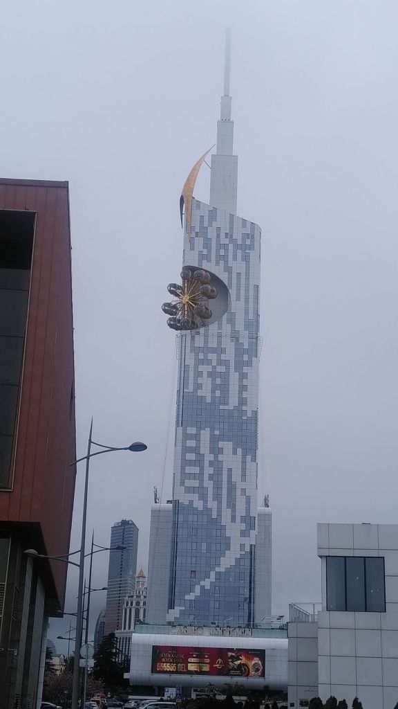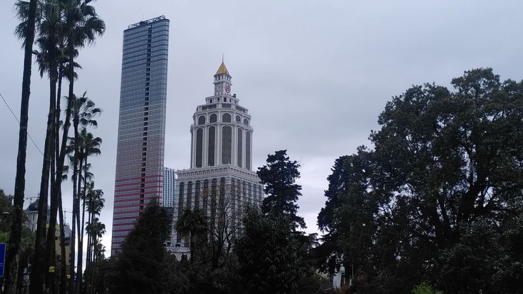 Der Batumi-Tower, zu dem wir uns bringen lassen, wurde 2012 fertig gestellt. Er hat 35 Stockwerke und besitzt als Besonderheit ein Riesenrad in der Fassade, das jedoch nicht in Betrieb ist. Nachdem die Pläne gescheitert waren, eine technische Universität im Batumi Tower zu eröffnen, stand der Wolkenkratzer jahrelang leer. Schließlich wurde das Gebäude zu einem Hotel umgebaut.