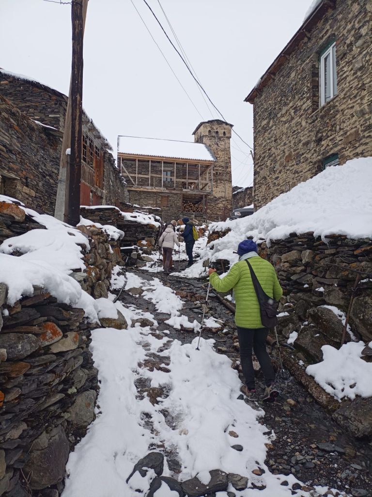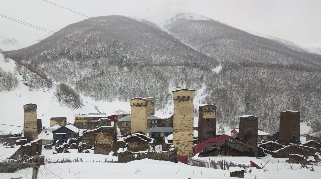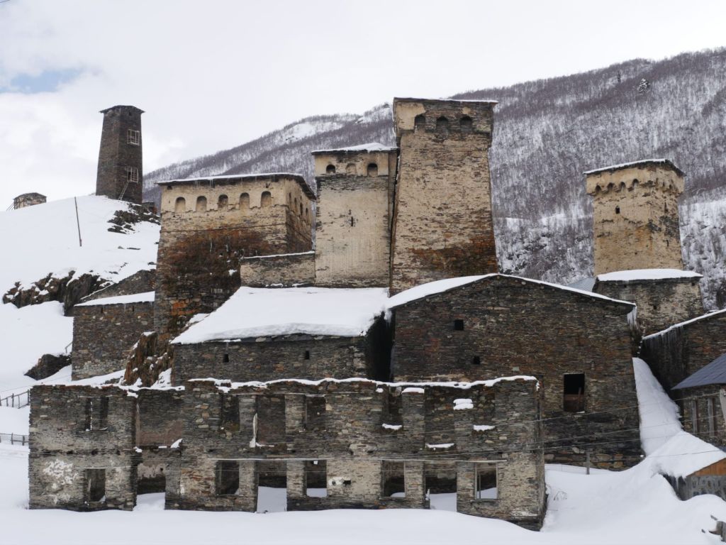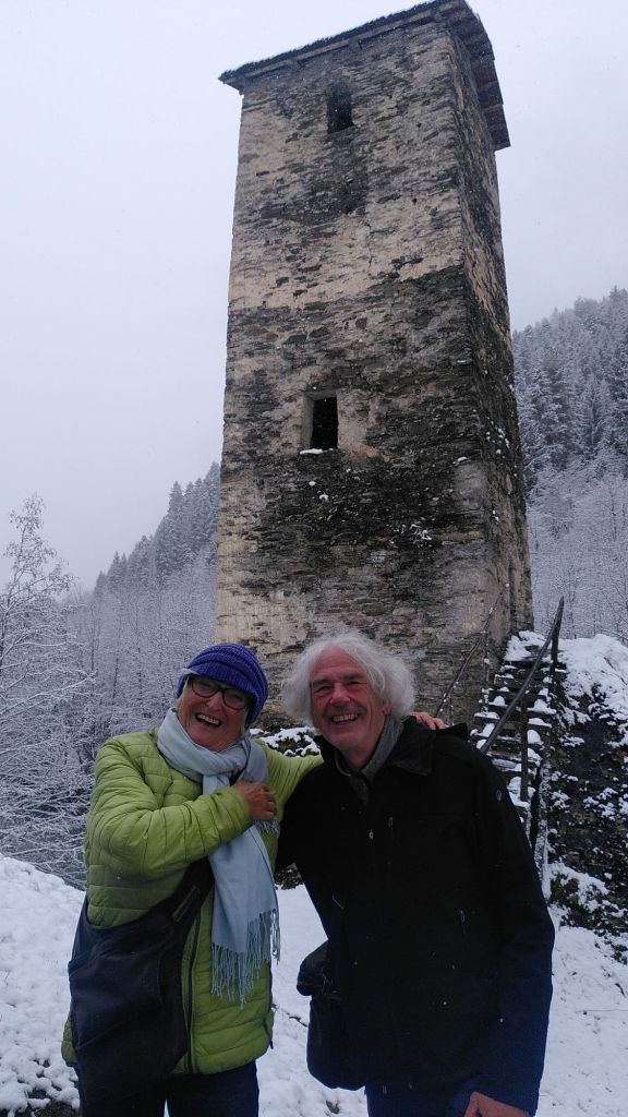 Leider schneit es, der Himmel ist grau und die Wolken verbergen die hohen Berge. Bald halten wir das erste Mal : Fotostop am Liebesturm. Unser Fahrer erzählt die swanetische Legende dazu: „An diesem Ort trafen sich eine junge Frau und ihr Freund regelmäßig für zarte Stunden. Eines Tages ging der junge Mann nach ihrem Treffen auf die Jagd und kam nicht wieder. Seitdem ging seine Freundin täglich zum früheren Treffpunkt und wartete auf ihn. Ihr Vater baute diesen Turm für sie, in dem sie fortan Ausschau nach ihrem Liebsten hielt.“