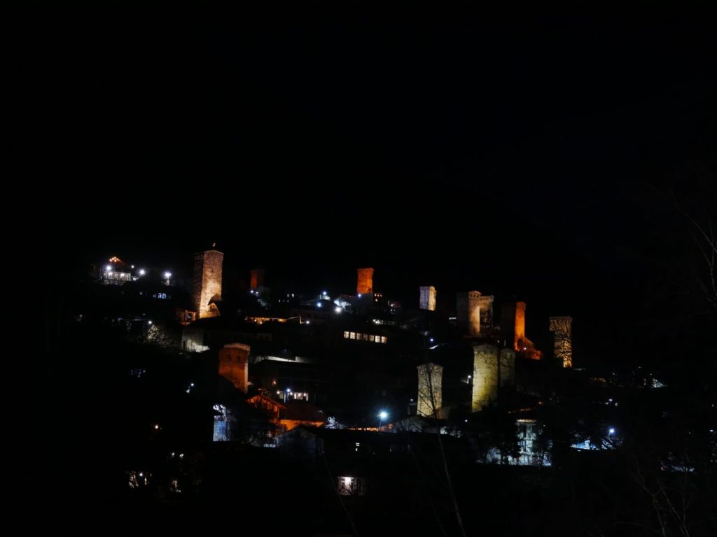 Die Wehrtürme in Mestia werden nachts angestrahlt. Auf dem Heimweg macht Achim noch dieses Foto.