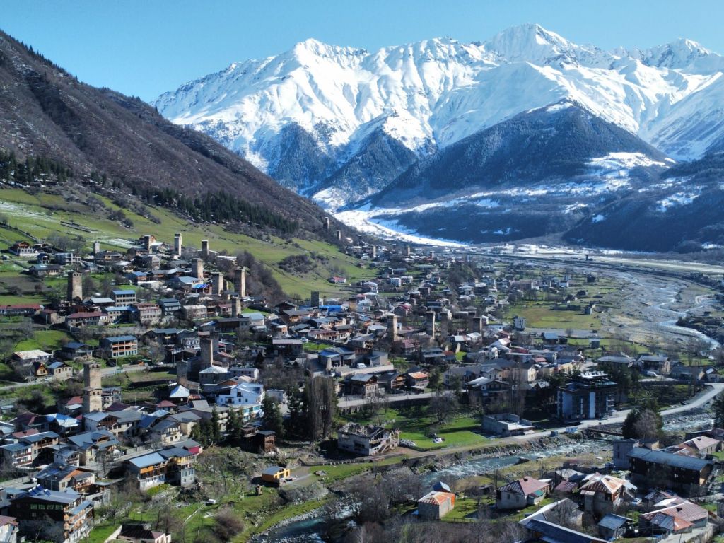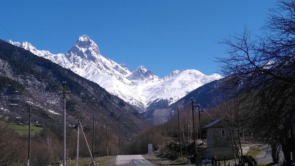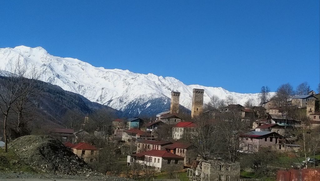Dreieinhalb Stunden meint unser Navi optimistisch. Wie lange wir wohl wirklich brauchen werden? Ich tippe auf sechs Stunden reine Fahrzeit. Wir werden es sehen. Jetzt sehen wir erst noch einmal viele alte Wehrtürme vor den majestätischen Gipfeln der Bakildi-Kette. Bei tiefblauem Himmel. Hätten wir dieses Wetter gestern in Ushguli gehabt, wären wir wohl trunken geworden.
