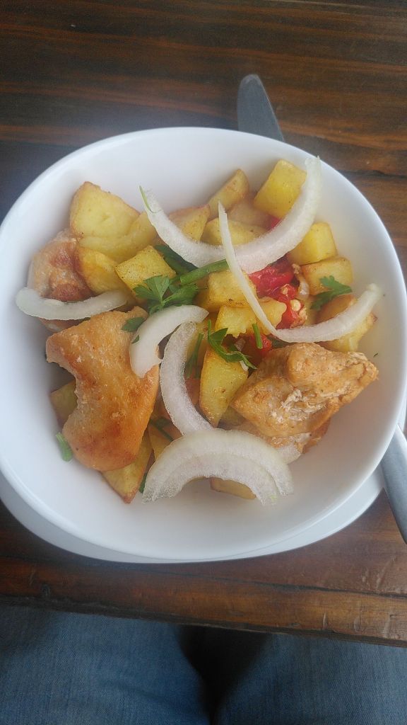 Mittagspause machen wir wie auf der Herfahrt bei Big Beni, wo wir die EU MitarbeiterInnen getroffen hatten. Hoi, hier erleben wir gleich mal einen Temperaturunterschied von 30 Grad: -5 beim Aufwachen und 25 (!) Grad jetzt. Zum Essen wählen wir diesmal Ojakhuri, Es ist eines der beliebtesten georgischen Gerichte. Übersetzt heißt es „Familienmahl“, weil es eben allen schmeckt. Unentbehrliche Grundzutaten sind Schweinefleisch und Kartoffeln, beim Rest sind zahlreiche Variationen möglich. Im Grunde sind es Bratkartoffeln mit Fleisch und Zwiebeln. Das hatte ich mir etwas interessanter vorgestellt. Vielleicht liegt es ja am Lokal.
