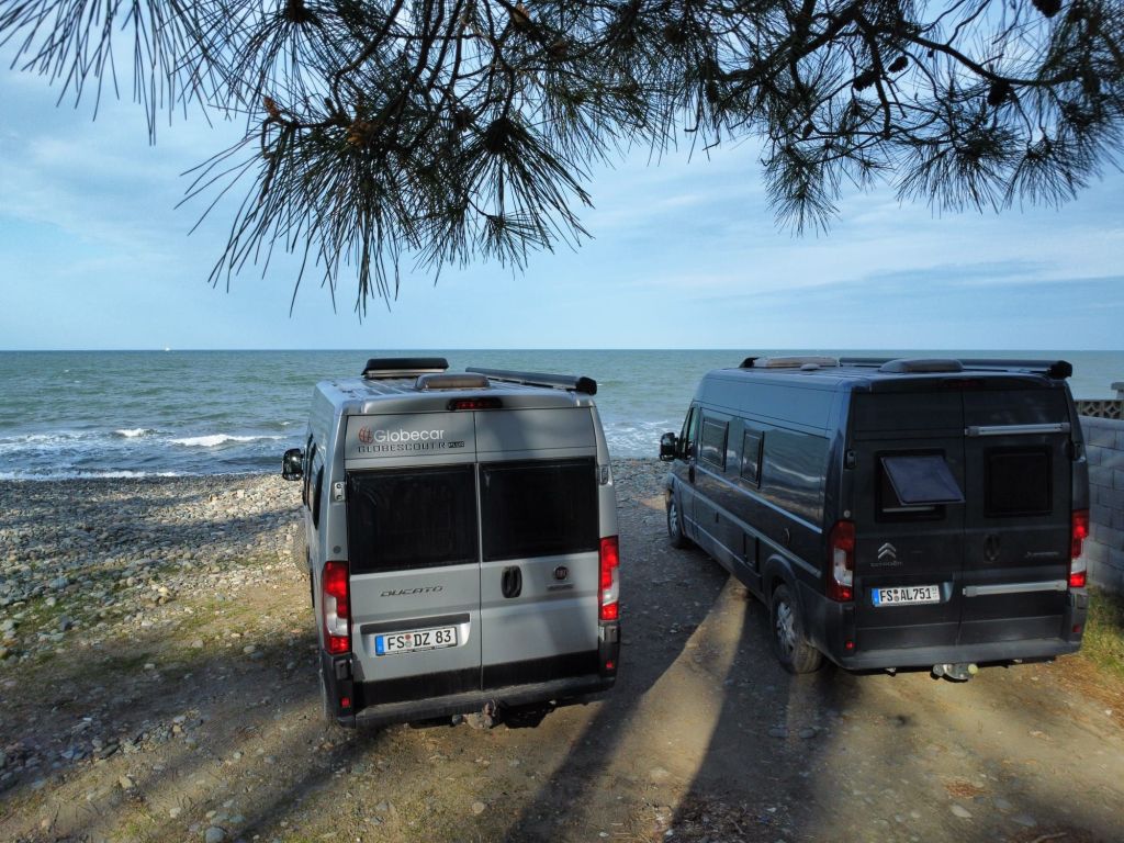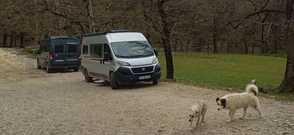 Es ist schon nach Sechs, als wir wieder bei den Bussen sind. Wir haben am Anfang des Wanderweges geparkt und bleiben über Nacht hier stehen. Während Dorothee und Alain sich um die Spaghetti Bolognese kümmern, schnippele ich den Salat. Mit uns werden etwa acht Hunde hier schlafen. Hoffentlich ohne nächtliche hündische Unterhaltung.