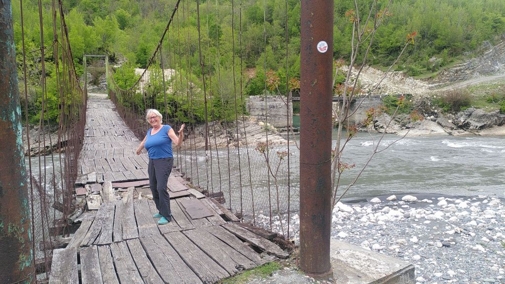 Schon die Anreise ist im letzten Abschnitt eine kleine Herausforderung: Wir fahren steil ins Flussbett hinunter und auf der anderen Seite wieder hoch, in Serpentinen und engen, steilen Kehren. Über diese Hängebrücke müssen wir zum Glück nicht.