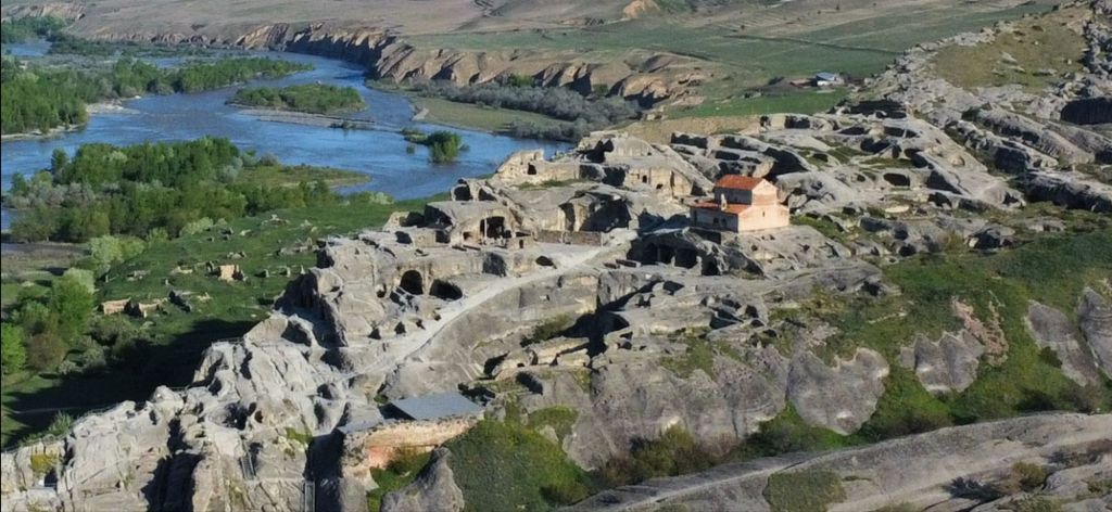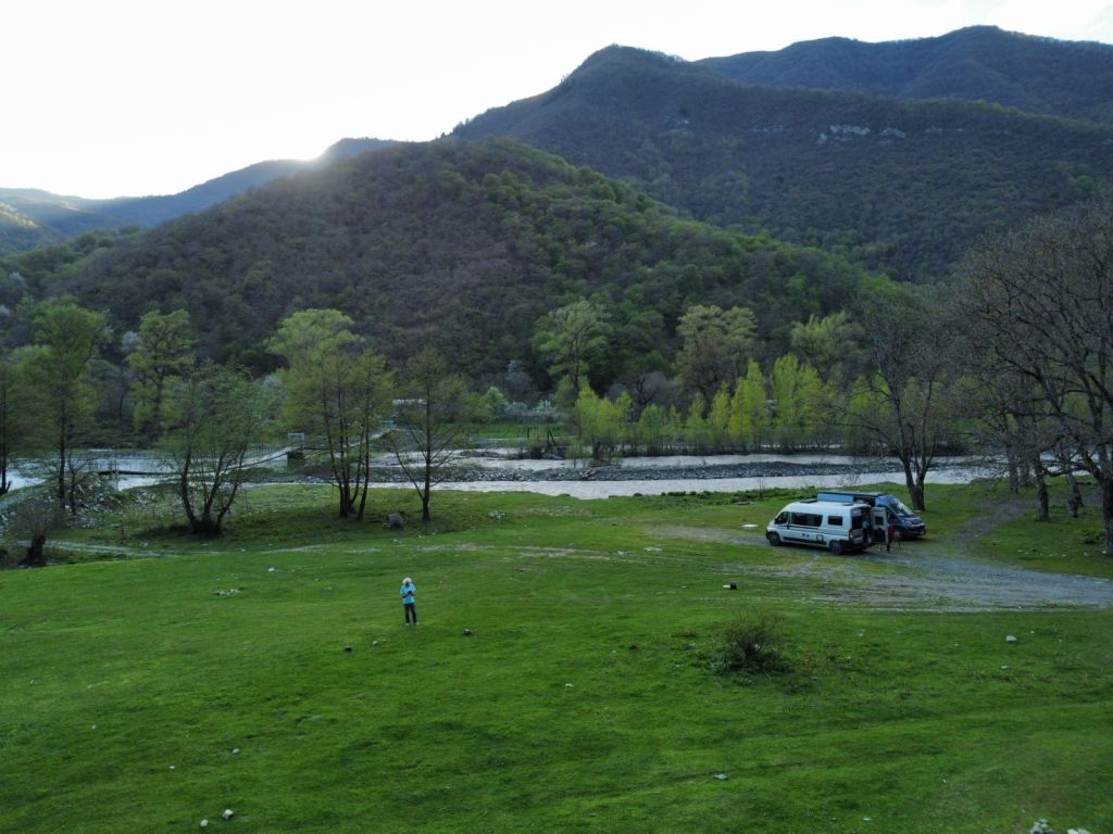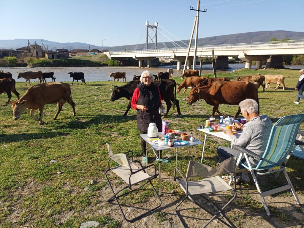 Wach werden am Fluss und (mit der Drohne) Aussicht auf die Höhlen von Uplisziche genießen. Die Sonne meint es so gut mit uns, dass wir wieder einmal draußen frühstücken können.