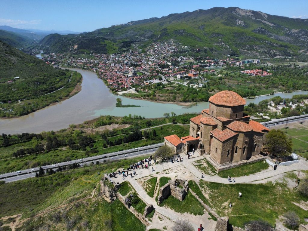 Eine gut ausgebaute Straße führt uns in Serpentinen in die Höhe und die Aussicht von hier oben ist ein großartiger 360 Grad-Rundumblick. Die beiden größten Flüsse Ostgeorgiens, der Mtkwari und der Aragwi fließen hier zusammen.
