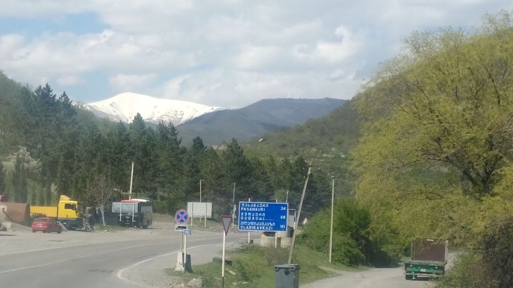 Zehn Kilometer weiter nördlich stoßen wir auf die berühmte Heerstraße und sind erstmal perplex: so viel Verkehr, jede Menge Geschäfte, auch die großen Burger-Brater sind vertreten. Großraum Mzcheta oder Hauptverbindungsstraße nach Russland? Immerhin spitzen langsam die ersten hohen Berge heraus. Dann nimmt auch der Verkehr ab und es wird ruhiger.