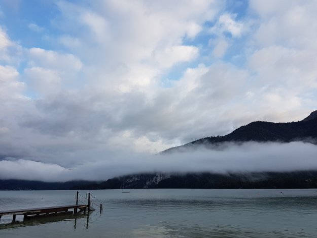 Am Nachmittag erreichen wir unser heutiges Tagesziel, den Wolfgangsee. Es regnet. Es regnet zunehmend. Es schifft.