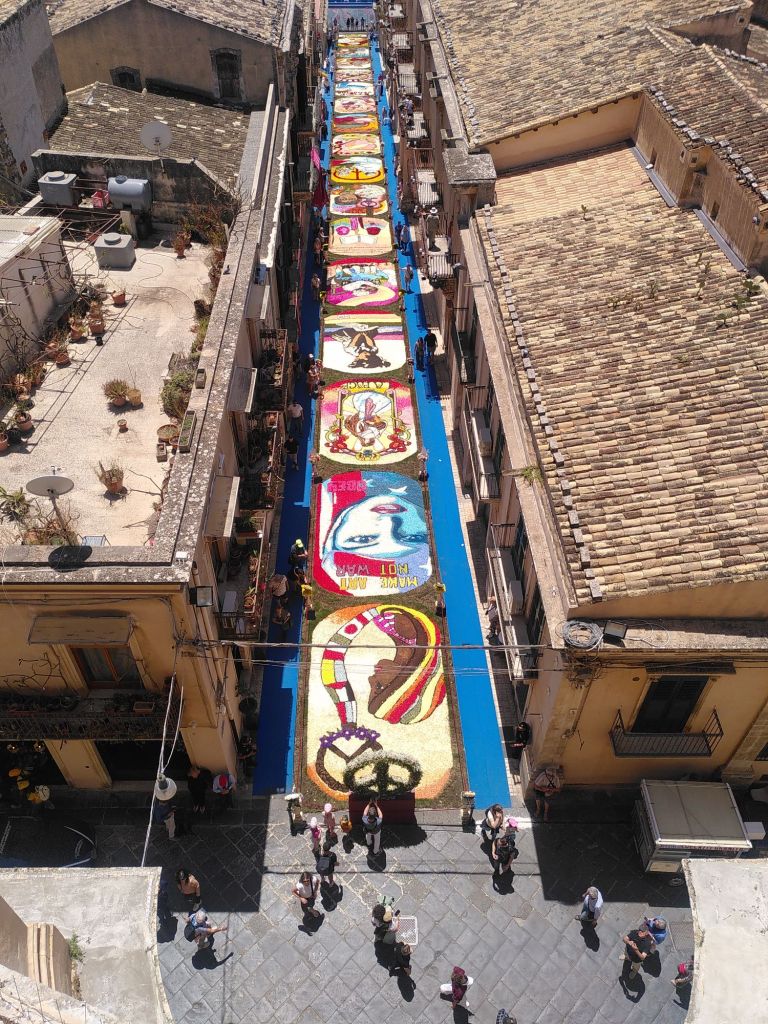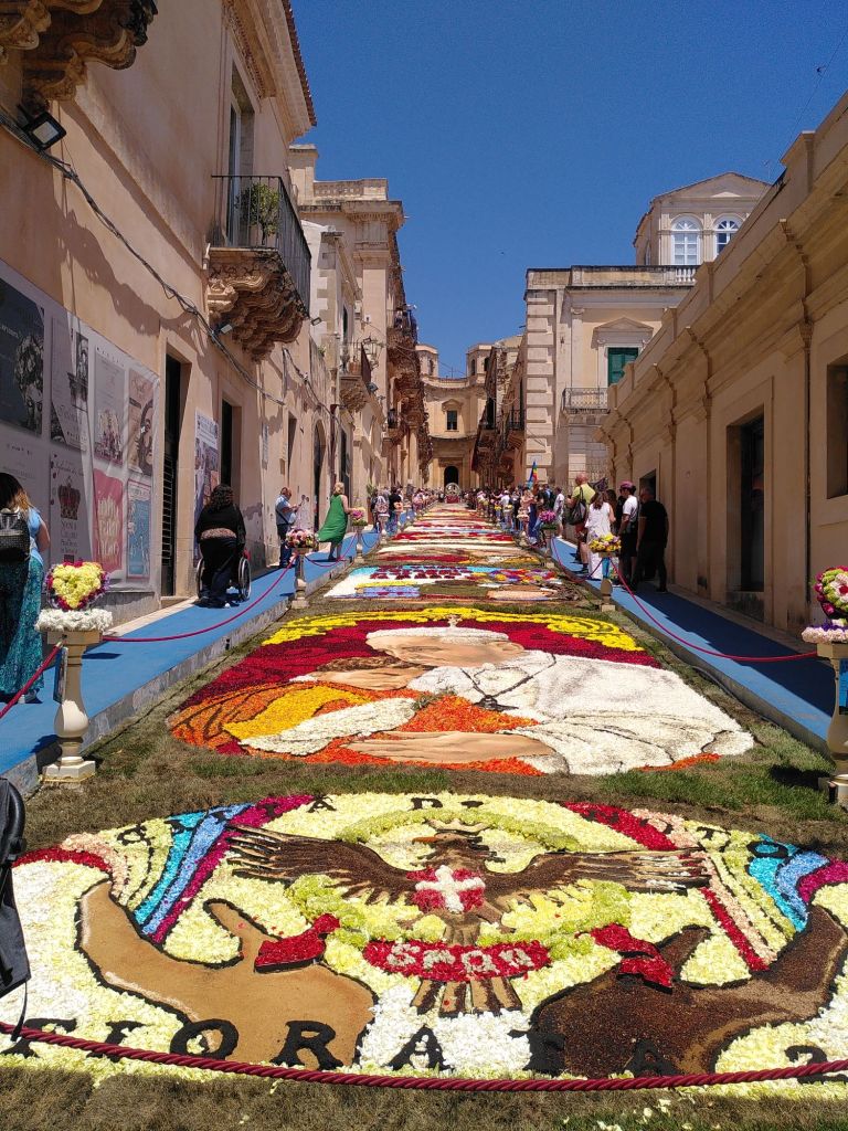 Seit 1980 findet um den dritten Sonntag im Mai herum die Infiorata, statt. Im Herzen der barocken Altstadt auf der Via Nicolaci, einer der Prachtstraßen Notos, entstand am vergangenen Freitag ein farbenfroher Blumenteppich: 122 Meter lang und sieben Meter breit, der über 700 Quadratmeter bedeckt, mit 400.000 Blumen.