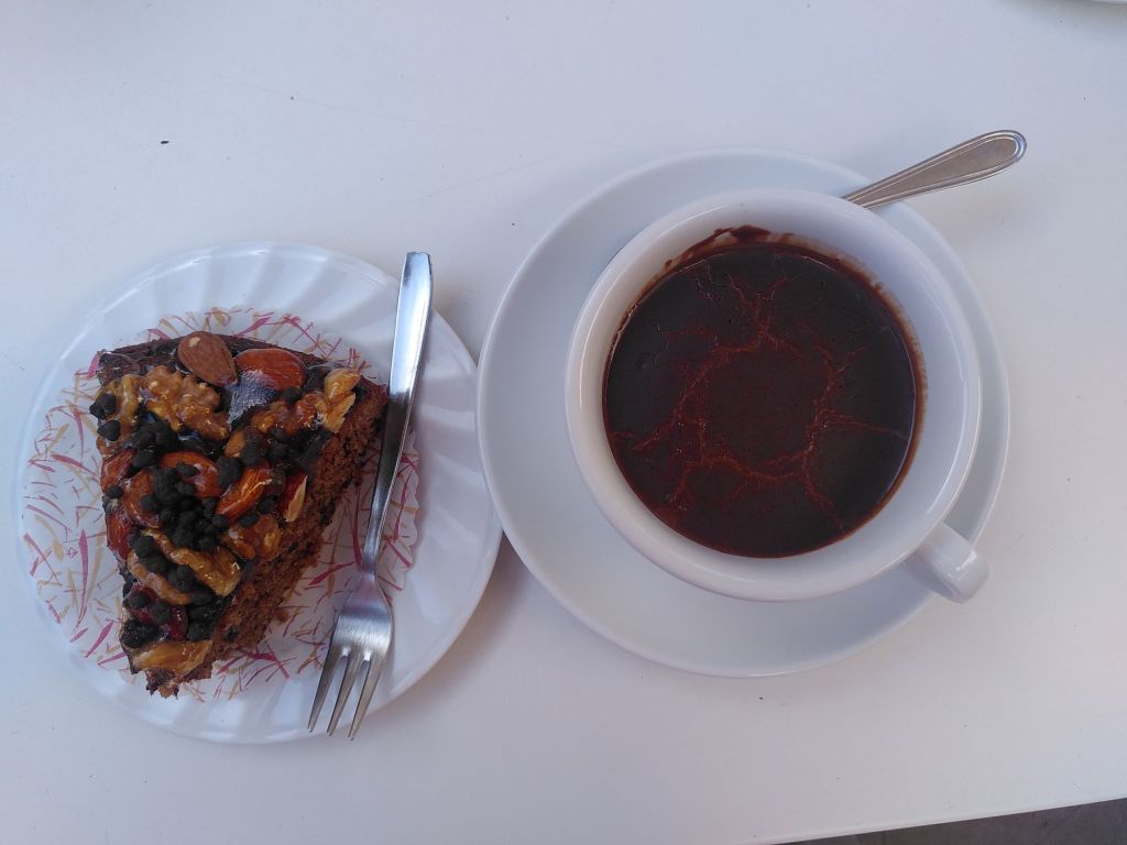 Statt Kaffee bestelle ich mir zur Nuss-Schokoladen-Torte eine Trinkschokolade zubereitet aus guter Modica-Schokolade, die nicht getrunken werden kann sondern gelöffelt werden muss.