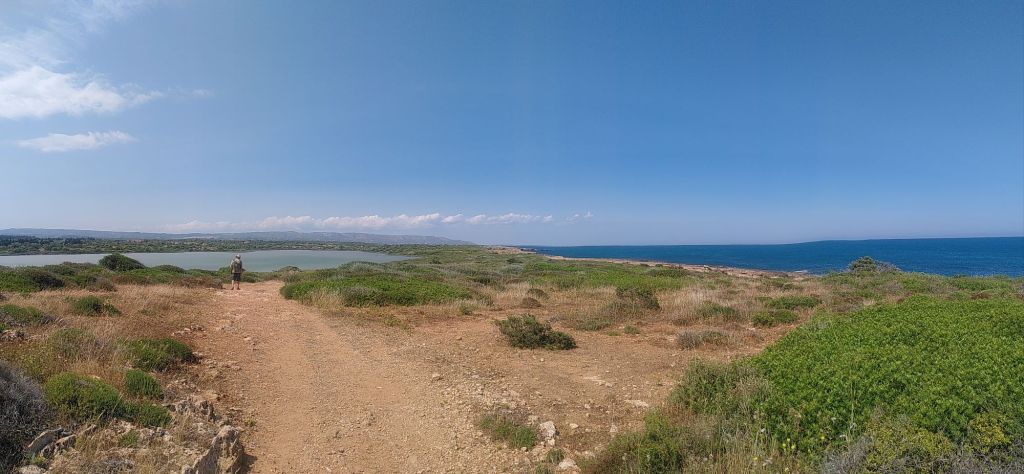 Gegen Mittag kehren wir dem schönen Syrakus den Rücken zu und fahren die Küste entlang weiter nach Südwesten. Achim hatte auf maps einen Ort gesehen, zu dem er unbedingt wollte. Während wir in der Mittagshitze über Stock und Stein Richtung Meer balancieren, stöhne ich: „Wo Du mich immer hinführst!“