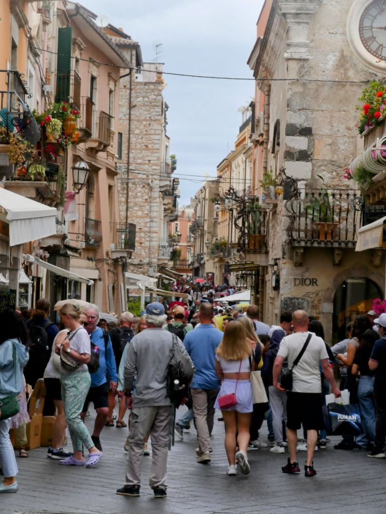 Was mag hier erst zur Hauptsaison los sein? Schon jetzt drängen sich die Touristen durch die Gassen, bieten Boutiquen, Andenkenläden, Imbissstände ihre Töpferwaren, Schmuckstücke, Kleidungsstücke, Foccacia, Arancini und Canoli an. Ein Gewirr von Stimmen liegt in der Luft.